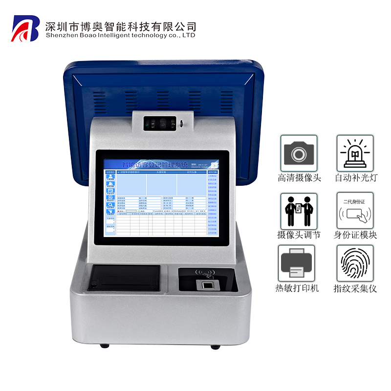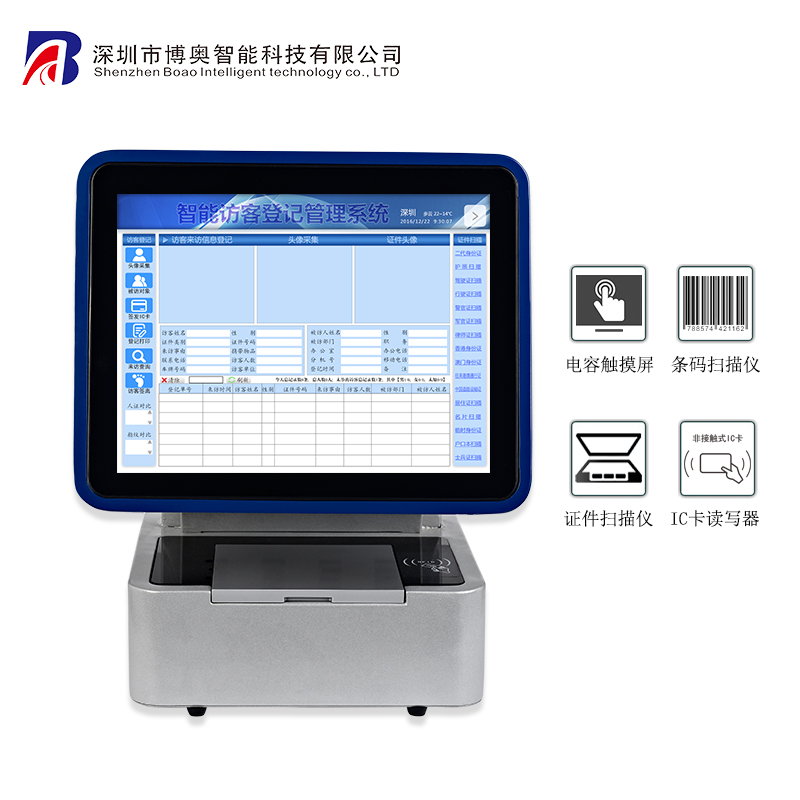 15雙屏智能訪客機BA-IVB1是我公司研新一代高端智能訪客登記管理設備,整機符合人體工程設計,機身小巧,外形新穎、美觀、簡潔,內部模塊化設計、維護方便;采用多點電容觸摸屏設計,點擊靈敏、操作方便,支持雙屏同步顯示和異步顯示,集成證件OCR掃描識別、身份證讀取,IC卡讀寫、人臉抓拍比對、指紋采集比對、條碼掃描、訪客單打印等功能,能夠迅速的完成訪客登記保存查詢工作。