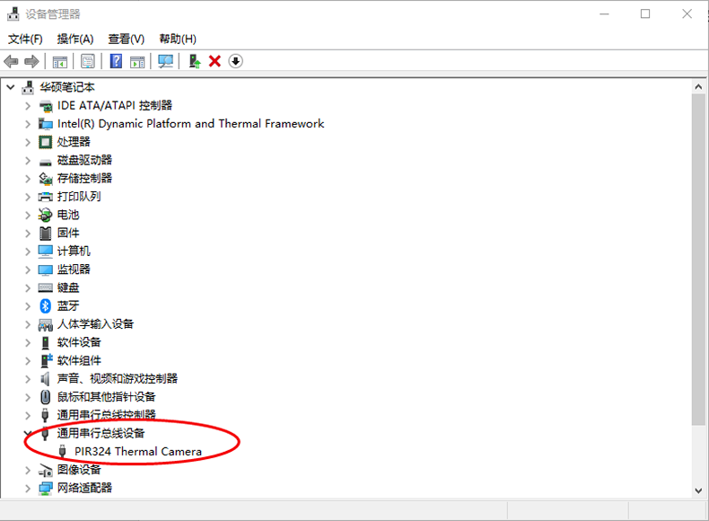 用Micro USB 2.0數(shù)據(jù)線(xiàn)連接電腦和R1相機(jī)后,打開(kāi)“設(shè)備管理器”,找到“Universal Serial Bus devices”或者“通用串行總線(xiàn)”中的感嘆號(hào)設(shè)備“PIR324 Thermal Camera”