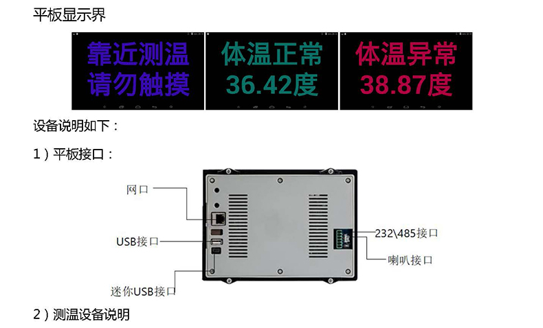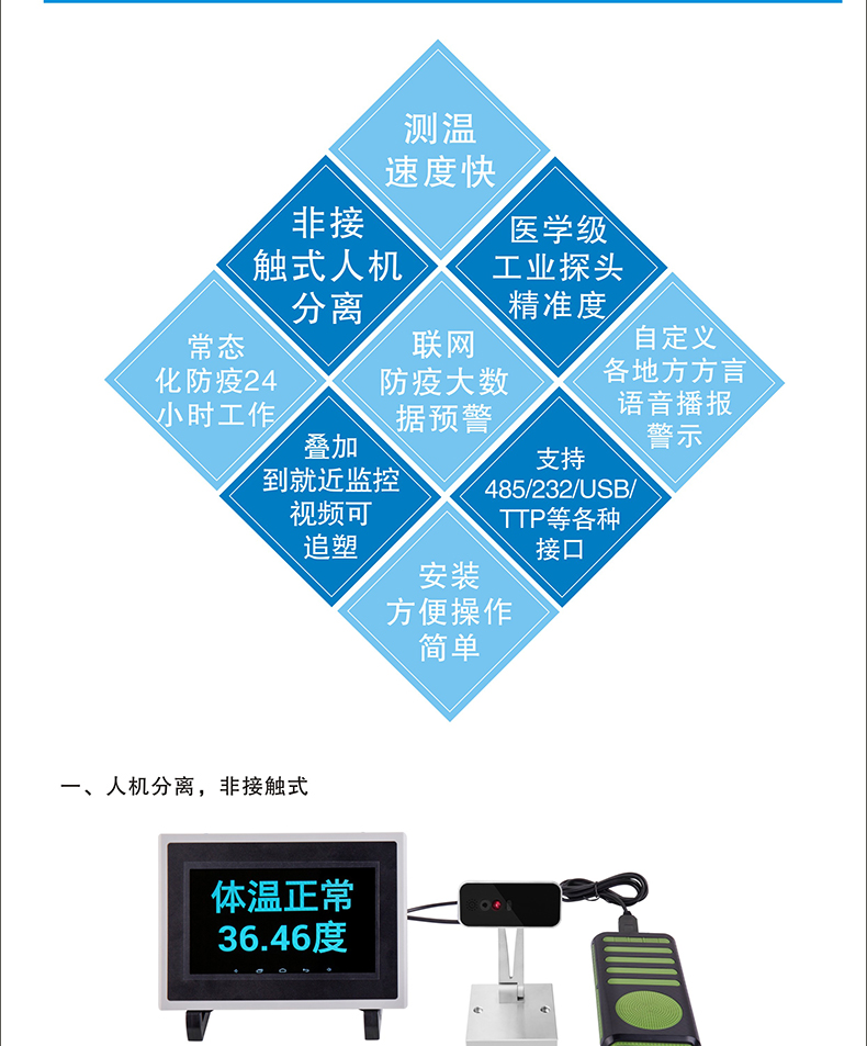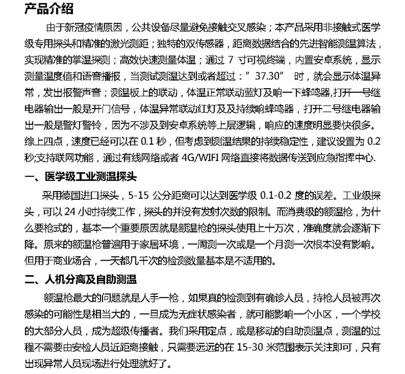由于新冠疫情原因,公共設備盡量避免接觸交叉感染;本產品采用非接觸式醫(yī)學級專用探頭和精準的激光測距;獨特的雙傳感器,距離數據結合的先進智能測溫算法,實現精準的掌溫探測;高效快速測量體溫;通過7寸可視終端,內置安卓系統(tǒng),顯示測量溫度值和語音播報,當測試測溫達到或者超過:”37.30”