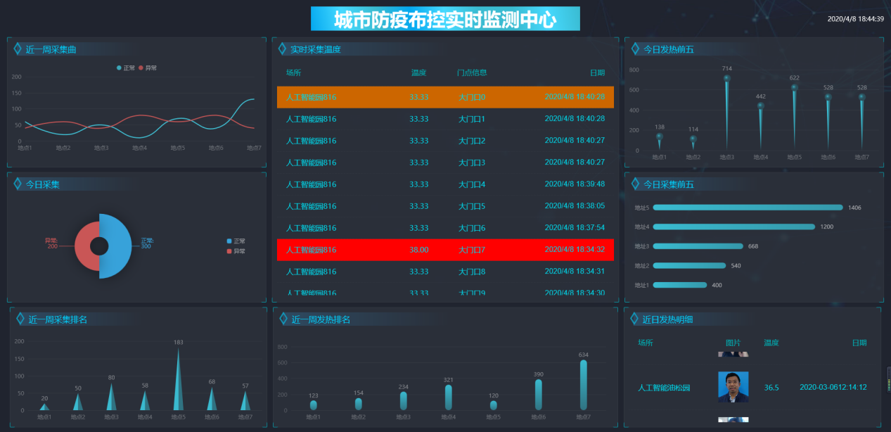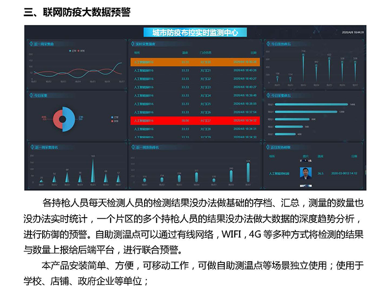 各持槍人員每天檢測人員的檢測結果沒辦法做基礎的存檔、匯總,測量的數量也沒辦法實時統(tǒng)計,一個片區(qū)的多個持槍人員的結果沒辦法做大數據的深度趨勢分析,進行防御的預警。自助測溫點可以通過有線網絡,WIFI,4G等多種方式將檢測的結果與數量上報給后端平臺,進行聯(lián)合預警。
