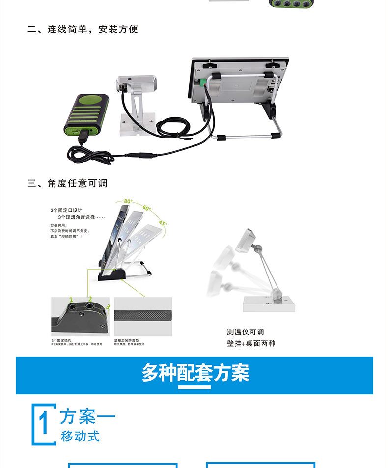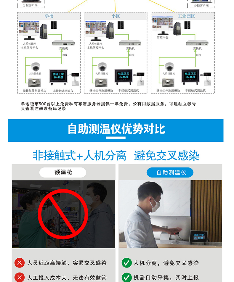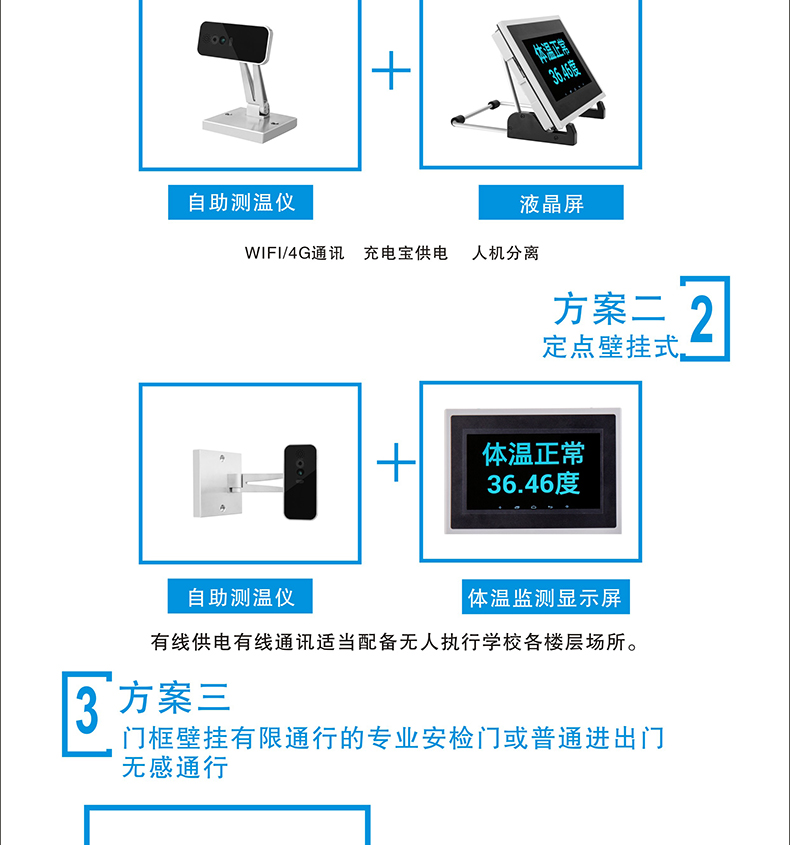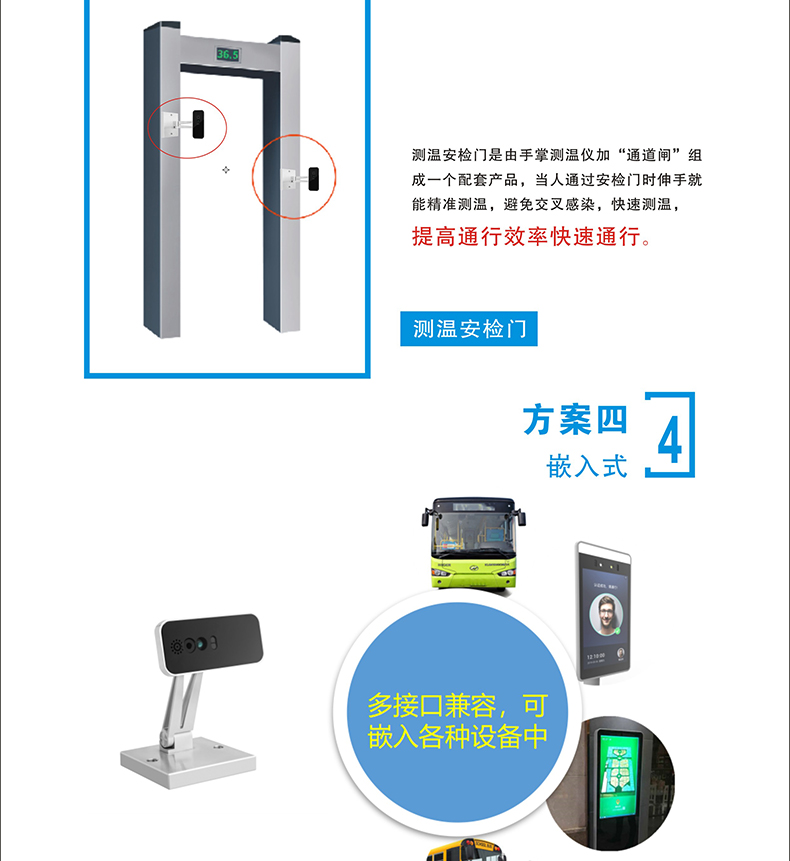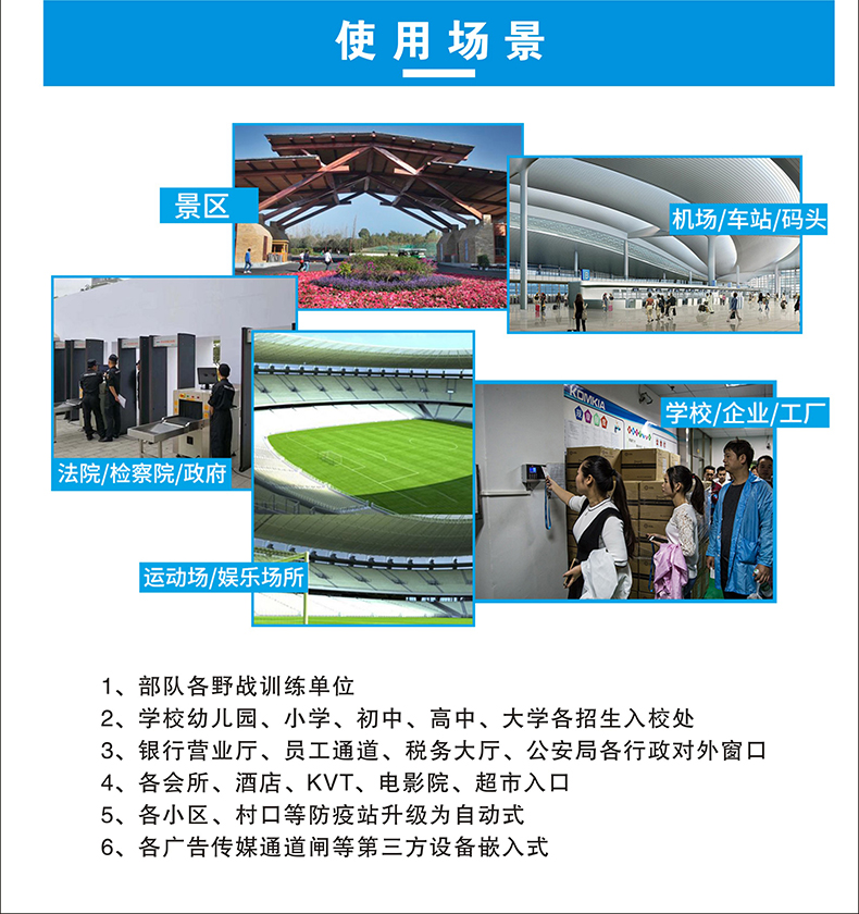 本產品安裝簡單、方便,可移動工作,可做自助測溫點等場景獨立使用;使用于學校、店鋪、政府企業(yè)等單位;