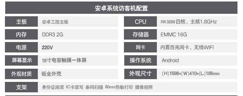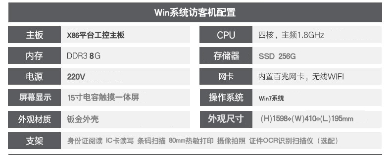 ?? ? ?15寸立式訪客機整機采用流線性設(shè)計,符合人體工程原理,結(jié)構(gòu)合理,外形美觀大方,操作簡單,維護方便;集成身份證閱讀 、IC卡讀寫、 條碼掃描、 80mm熱敏打印、 攝像拍照、 多種證件OCR識別掃描(選配)功能,支持安卓和Windows系統(tǒng) ;產(chǎn)品主要用于政府機關(guān)、軍隊、公安、法院、學(xué)校、事業(yè)單位、花園小區(qū)、高檔寫字樓、工廠等場所的門衛(wèi)傳達室對進出人員信息化登記人證核驗,從而代替了傳統(tǒng)的手工登記,有效的提高了門衛(wèi)管理工作效率及證件信息登記準(zhǔn)確性,給日后的信息查詢工作更方便量更快捷。
