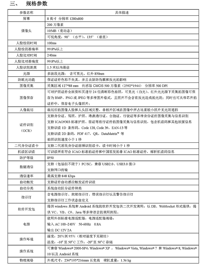 6) 高清拍攝,清晰視角:證件識(shí)別攝像頭500萬像素高清成像,物理分辨率達(dá)到500DPI;可見光采集圖像、紅外光識(shí)別;