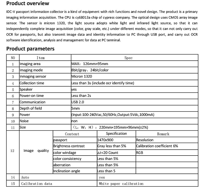 IDC-V passport information collector is a kind of equipment with rich functions and novel design. The product is a primary imaging information acquisition. The CPU is cy68013a chip of cypress company. The optical design uses CMOS array image sensor. The sensor is micron 1320, the light source adopts white light and infrared light source, so that it can independently complete image acquisition (color, gray scale, etc.) under different modes, so that it can not only carry out OCR for passports, but also transmit image data and identity information to PC through USB port, and carry out OCR software identification, analysis and management for data at PC terminal.