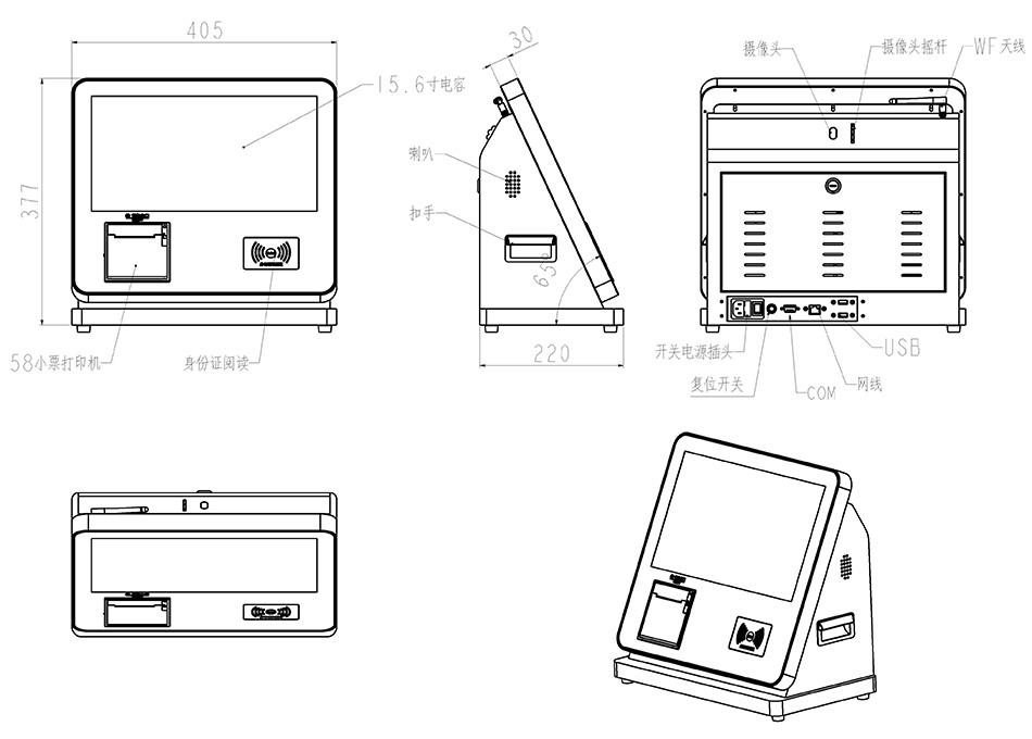 15.6寸臺式多功能一體機可應用到學校、機關、企業、工廠、醫院等場所門衛大廳做訪客登記系統、社保查詢終端,產品外殼采用鈑金,表面烤漆工藝,設備集成15.6觸顯一體屏,身份證閱讀器、IC卡讀寫器、熱敏打印機、條碼掃描儀、社保讀卡器、攝像頭等模塊;可安裝WIN系統和安卓系統,從而方便了軟件系統集成商開發應用,同時支持定制;包括外觀結構功能定制。