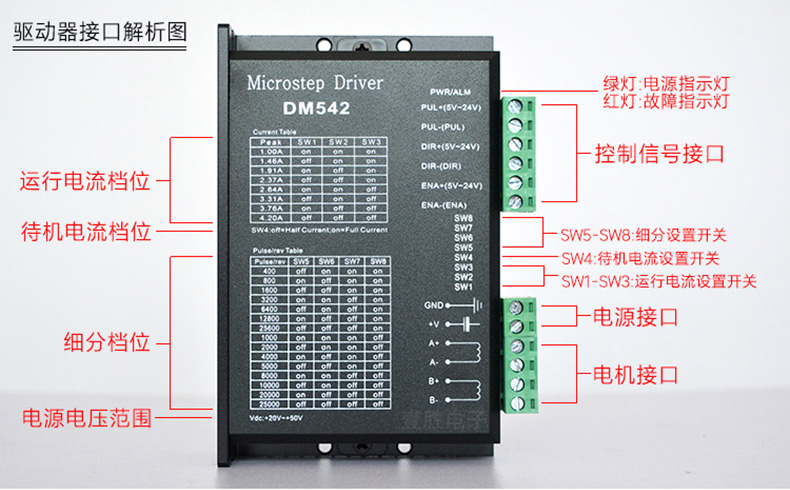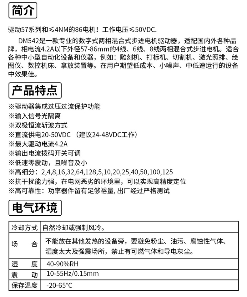 DM542 DSP 控制的數(shù)字式兩相混合式步進電機驅動器,適配相電流在 4.2A 以下、外徑 39,42,57,60,86mm 的四線,六線,八線兩相混合式步進電機。可設置128 內各種細分以及 4.2A 內各種電流,內部增加電機專用控制算法,能夠針對不同電機采用相應運行參數(shù),使電機運行非常平穩(wěn),震動以及噪聲極小。 內置過熱,過流,過壓檢測,保護驅動器穩(wěn)定運行。