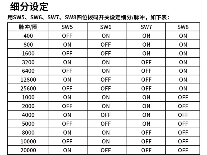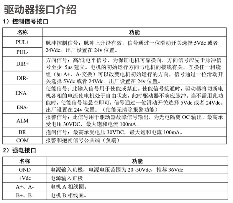 使能控制信號 此輸入信號用于使能或禁止驅動器輸出。ENA 接低電平(或內部光耦導通)時,驅動器將切斷電機各相的電流使電機處于自由狀態(tài), 不響應步進脈沖。當不需用此功能時,使能信號端懸空即可。5-24VDC 電平兼容。 |