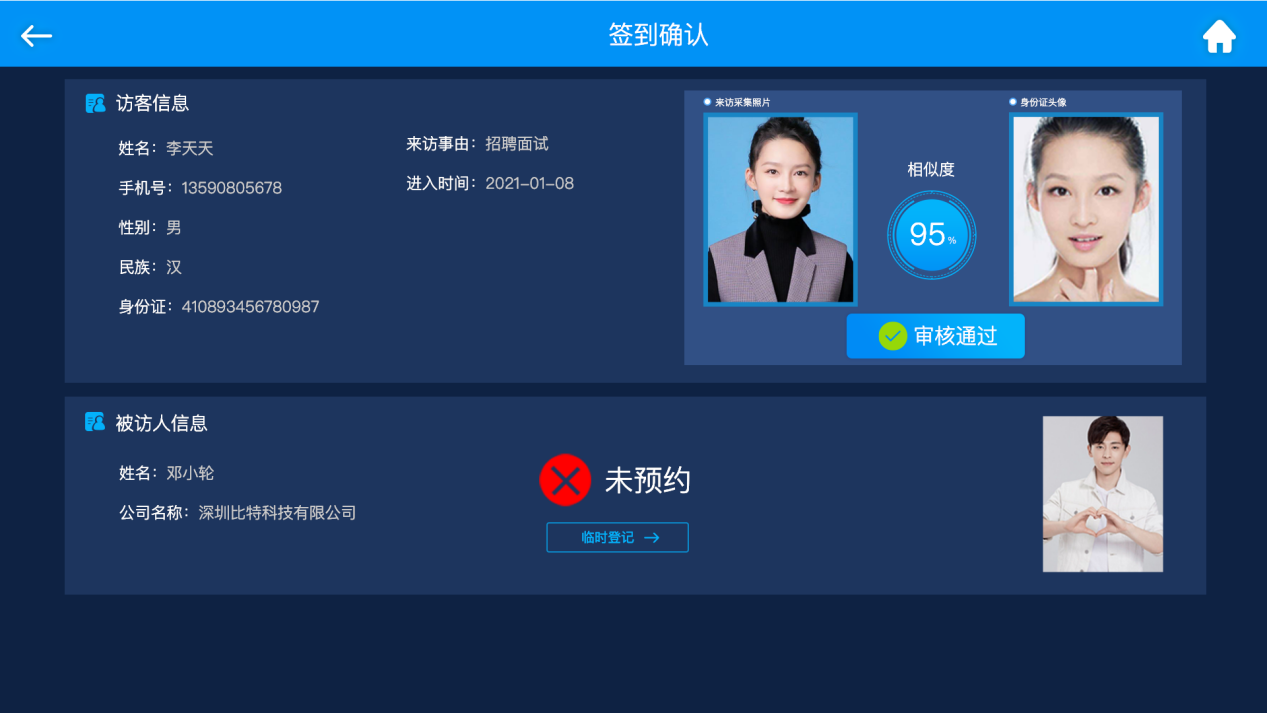在首頁界面,來訪者可直接刷身份證進行簽到確認,身份證識別成功后,會自動跳轉至人證比對界面。比對成功后會直接提示是否簽到成功。