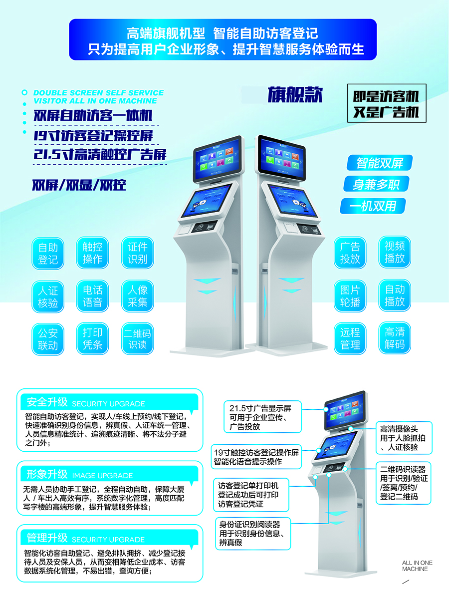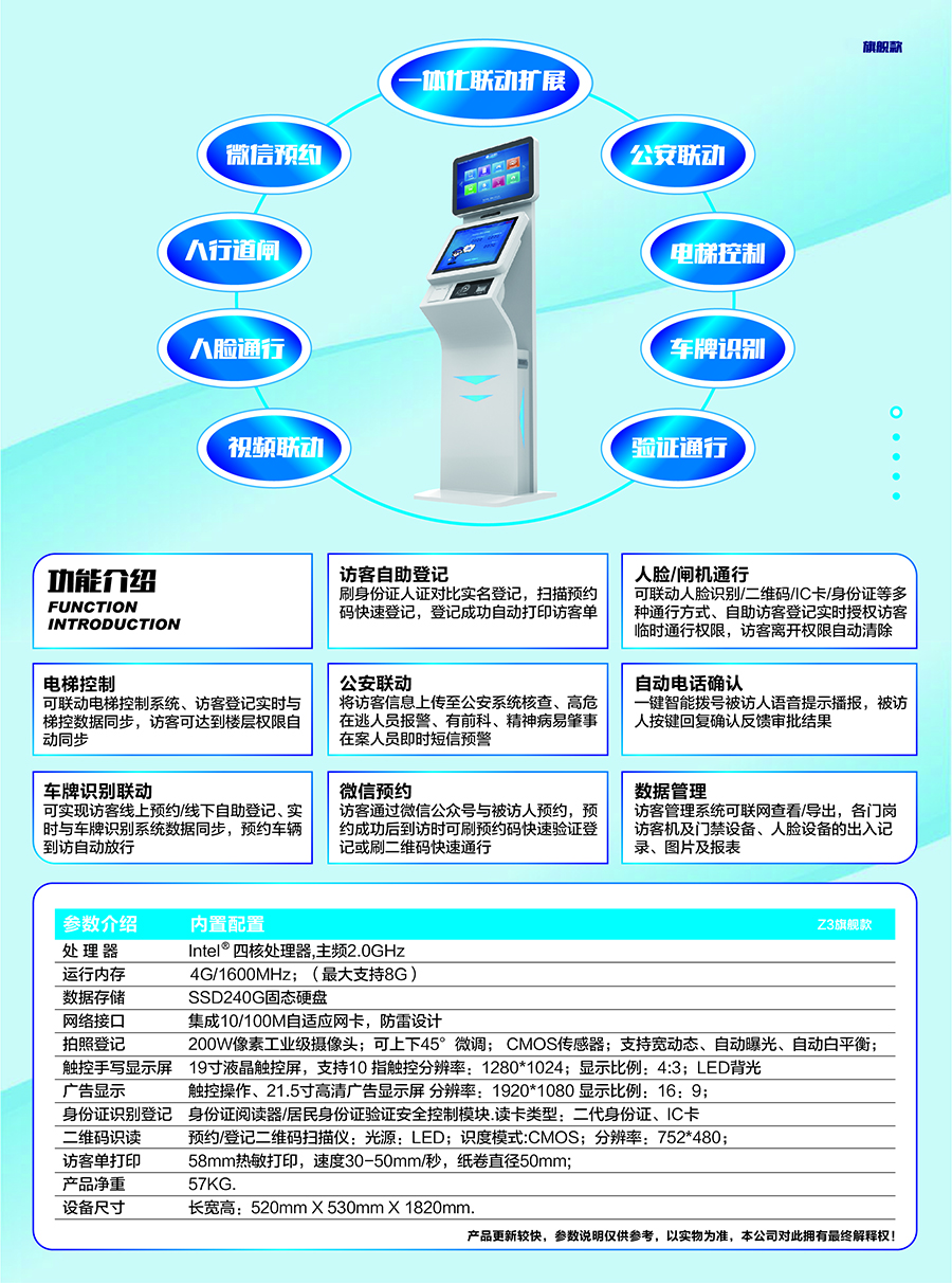 1. 刷二代身份證自動讀取證件內信息(判別真假), 2. 現場拍照人像采集、貴重物品拍照存儲,可多攝像頭視頻切換拍照。 3. 人證核驗比對功能;采集訪客身份證信息和現場人臉進出比對核驗,人證合一 4. 來訪人信息:類型、公司、事由、車輛、攜帶物等登記, 5. 被訪人信息選擇、手動填寫、默認, 6. 姓名、部門等快速定位和模糊查找,姓名拼音首字母快速查找;大單位按部門分層級查找,首字快速查詢, 7. 當日來訪總人數、離開人數、在訪人數實時統計顯示, 8. 被訪人電話號碼同步顯示, 9. 打印會客單簽字回執,可自定義, 10. 觸屏模式、軟鍵盤及手寫功能啟用, 11. 隨行人員登記管理一鍵綁定主訪客錄入隨行人員身份證信息,可設置不打印訪客單, 12. 黑名單設置 來訪時自動提醒該訪客為黑名單和備注的原因, 13. 未離開訪客明細表,可設多時段超時未離開人員明細 彈屏提醒, 14. 歷史被訪人資料是否彈屏提醒,還是找這個就不用再去查找了 15. 訪問人數限制提醒,如:部門每天接待超出20人超出預接待能力 系統自動報警提醒 |