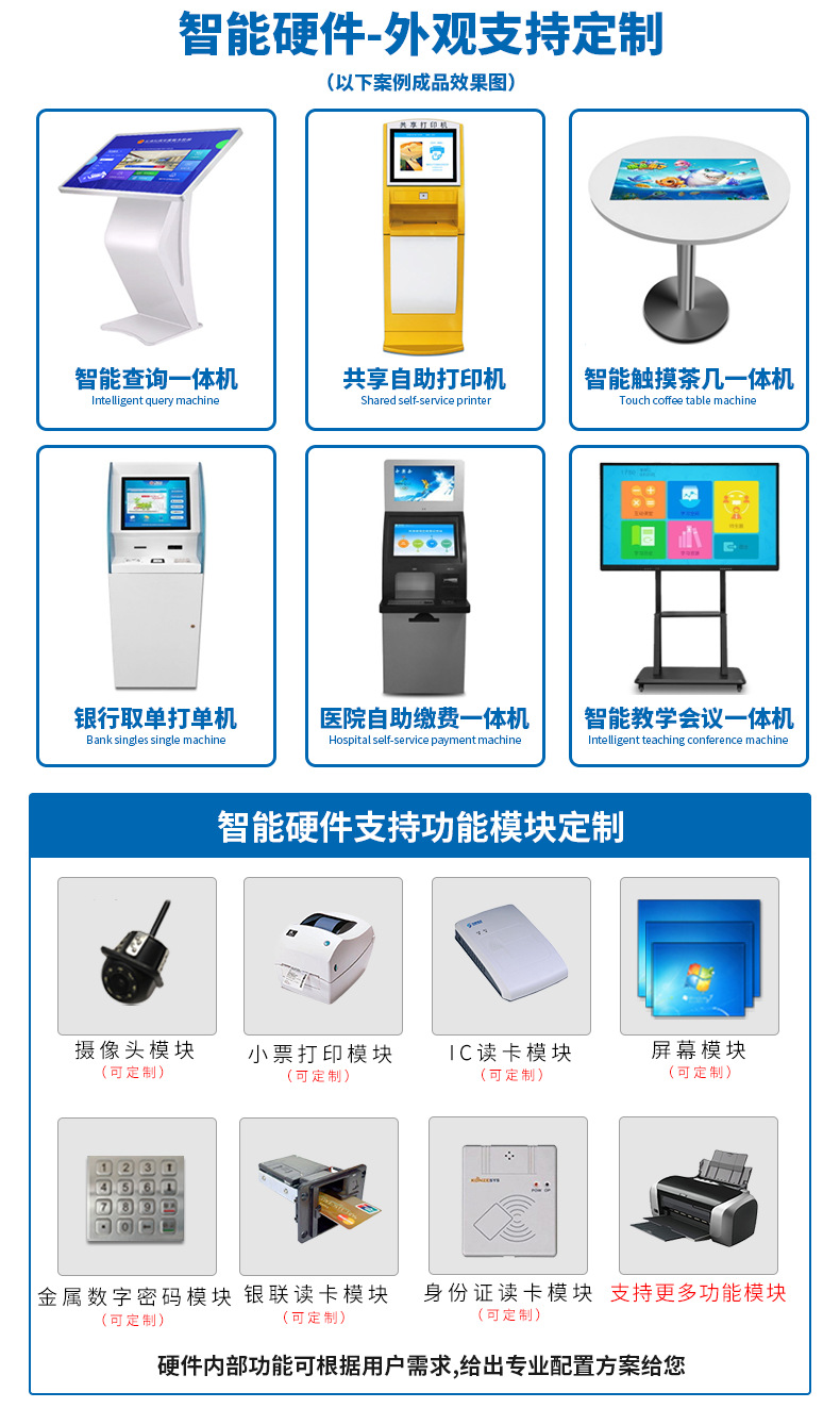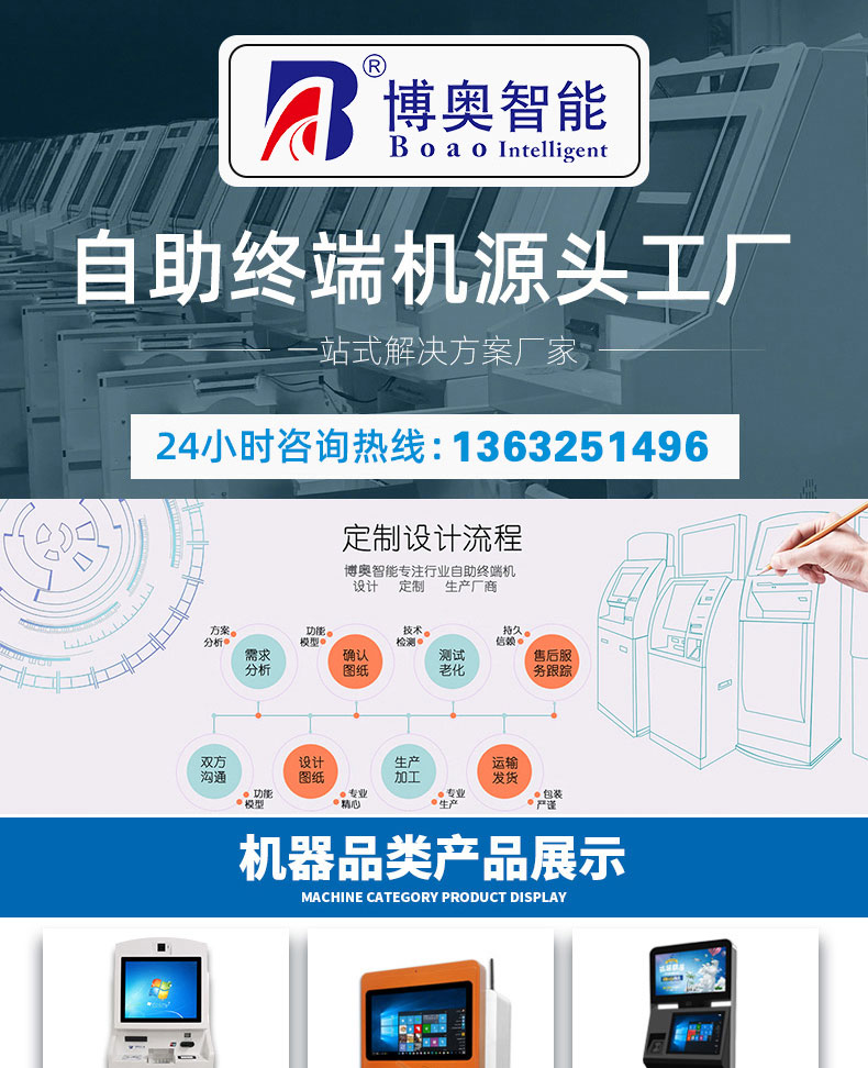 專業(yè)提供電腦觸控產(chǎn)品、自助服務(wù)終端的設(shè)計(jì)及生產(chǎn)服務(wù),主要產(chǎn)品自助終端機(jī)、自助打印機(jī)、自助取票機(jī)、自助查詢機(jī)、自助繳費(fèi)機(jī)、自助發(fā)卡機(jī)、自助政務(wù)一體機(jī),產(chǎn)品使用于各個(gè)行業(yè);醫(yī)院、學(xué)校、銀行、酒店、景區(qū)等。。。。。公司擁有專業(yè)的生產(chǎn)線,嚴(yán)格的質(zhì)量把控。耐心的咨詢服務(wù)團(tuán)隊(duì)及專業(yè)的技術(shù)負(fù)責(zé)團(tuán)體。
