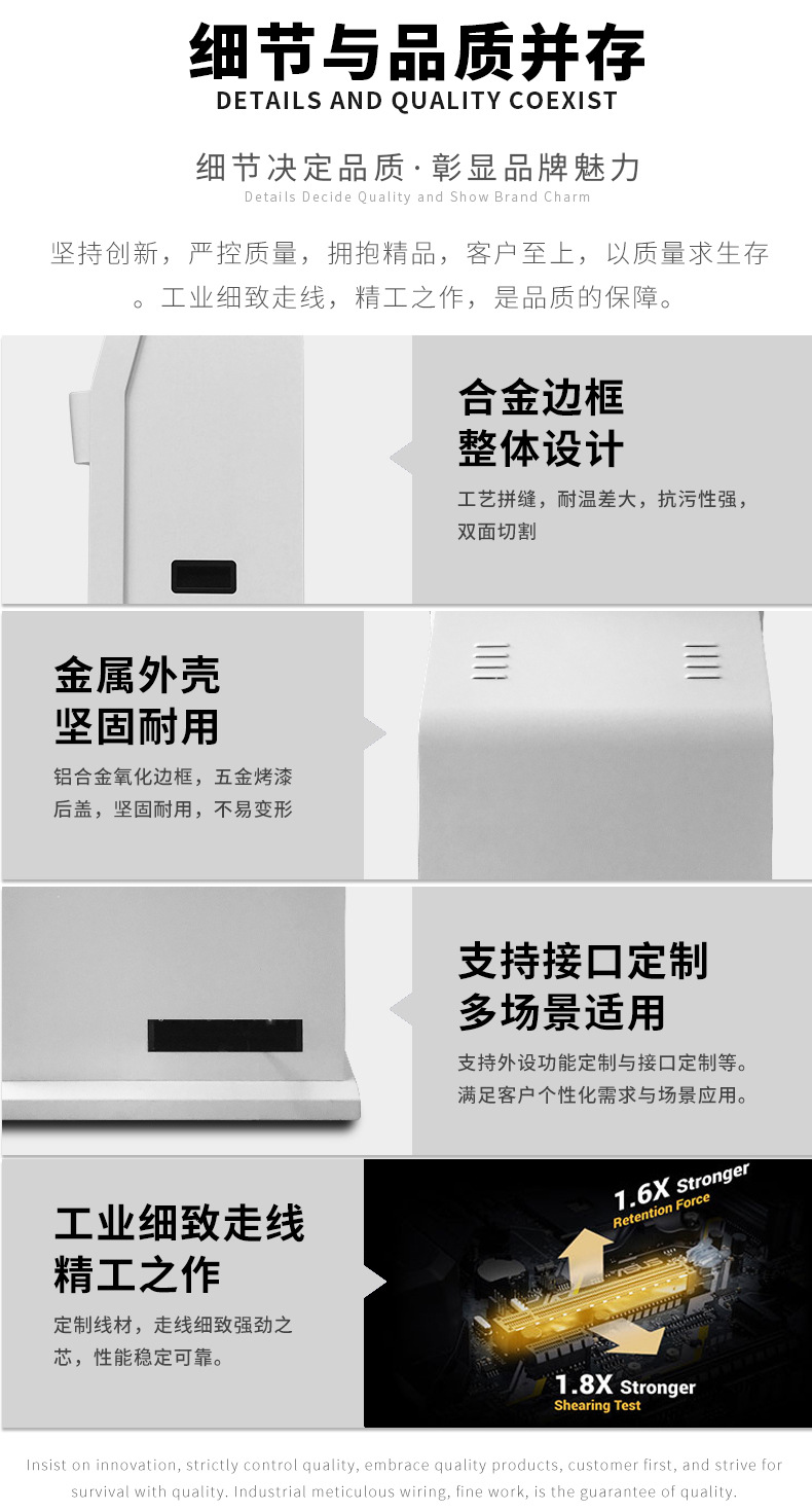 公司成產(chǎn)以“誠(chéng)信、團(tuán)結(jié)、務(wù)實(shí)、創(chuàng)新”的企業(yè)精神開拓市場(chǎng)、優(yōu)化產(chǎn)品細(xì)節(jié)提供舒適的自助體驗(yàn)。公司本著“誠(chéng)信為本,質(zhì)量至上”的取勝之道不斷開發(fā)自助終端在各行業(yè)的應(yīng)用,打造方便快捷的一站式服務(wù)。