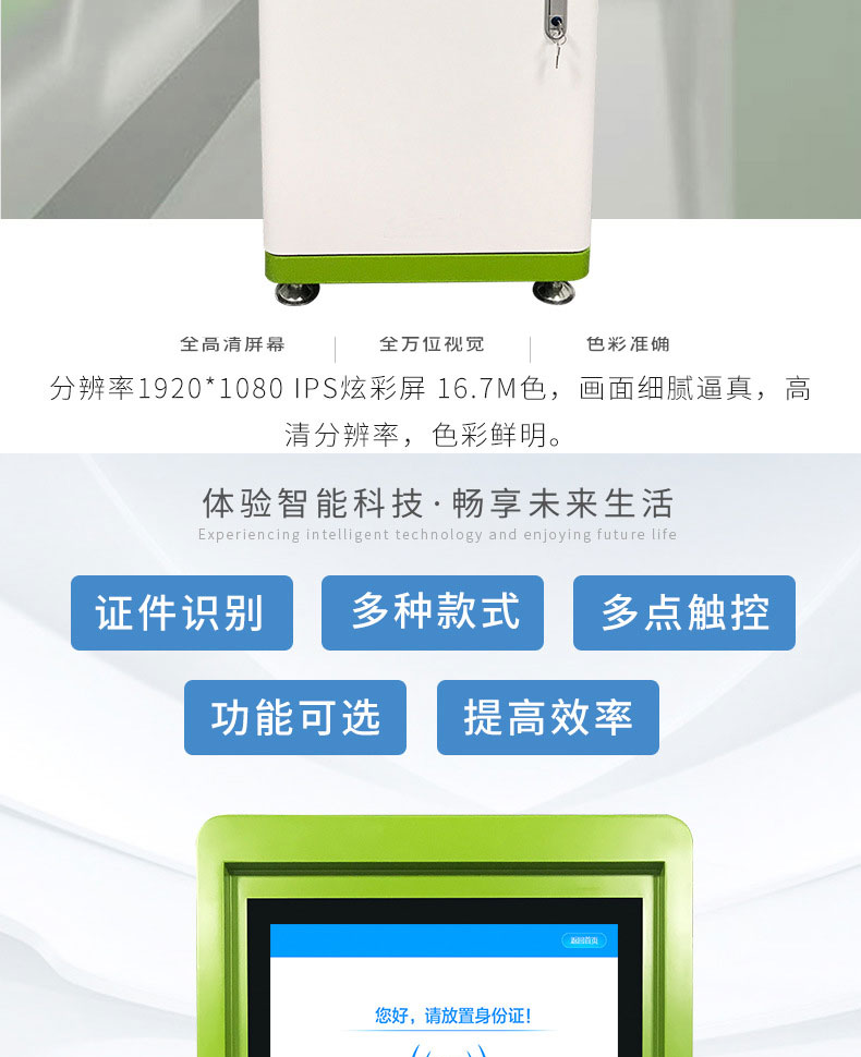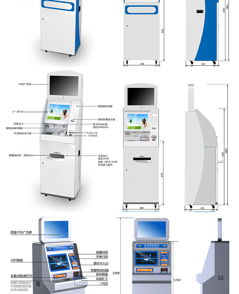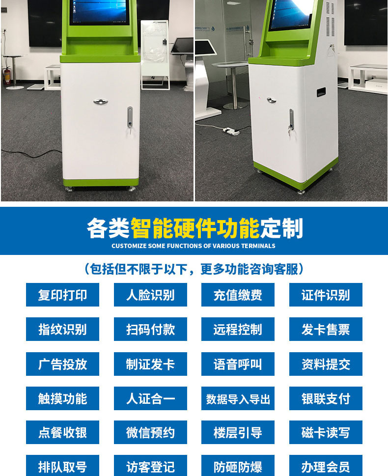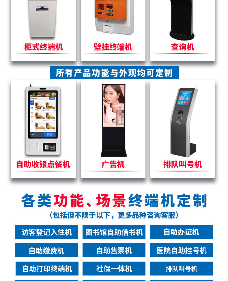 自助終端機定制:定制各種場景各種款式非標終端機;例如訪客機、景區自助取票機、醫院繳費查詢機、醫院自助取單機、社保查詢機、室內外廣告機、排隊叫號機、工控一體機、電力繳費查詢機、圖書自助銷售機、便攜式計算機、酒店自助入住機、自助收銀機等終端。