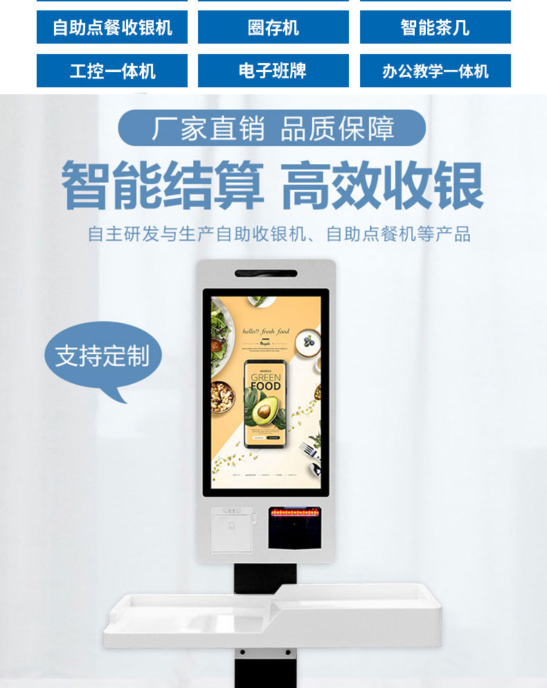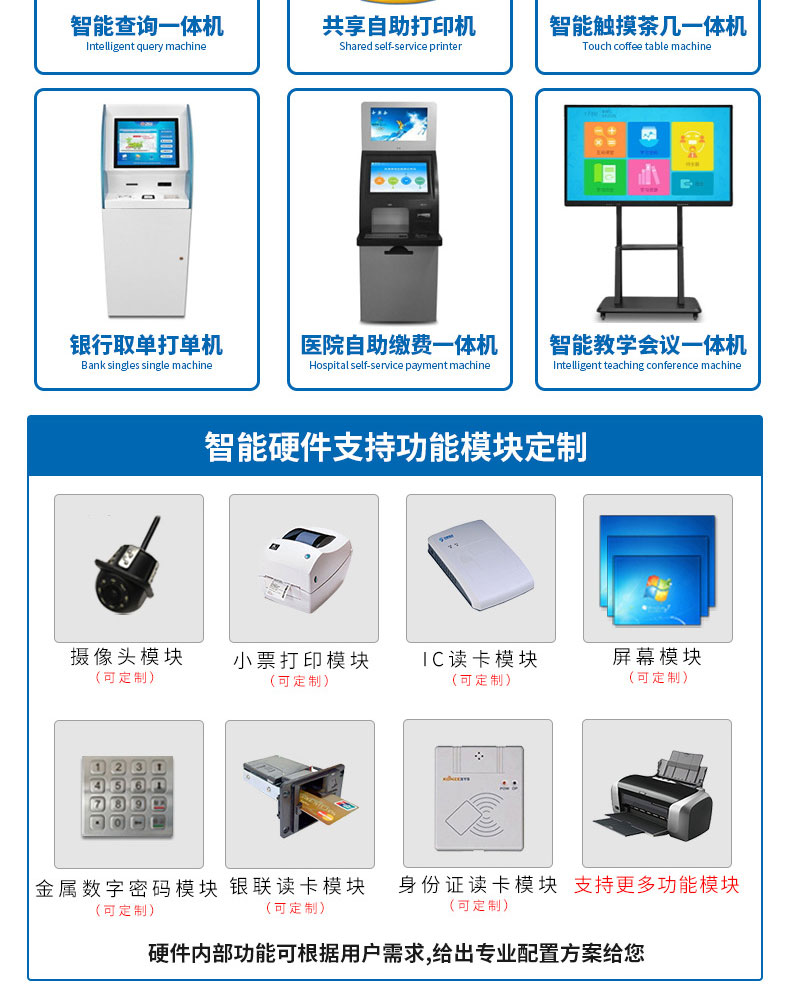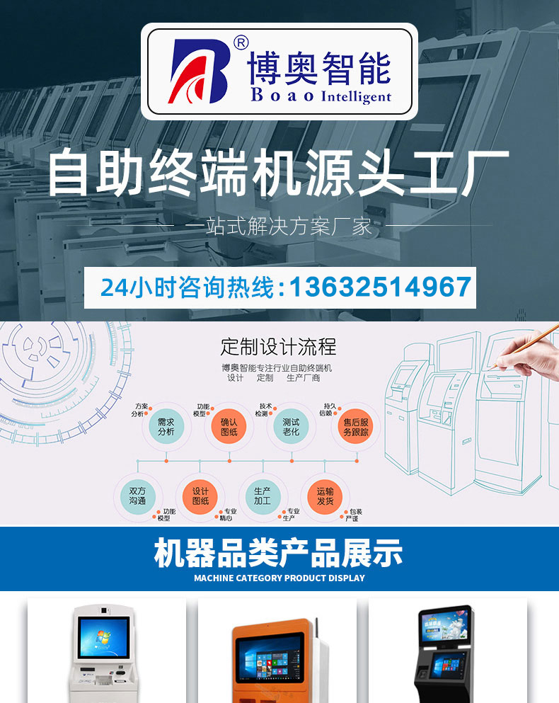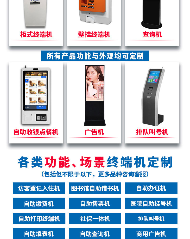 專業提供電腦觸控產品、自助服務終端的設計及生產服務,主要產品自助終端機、自助打印機、自助取票機、自助查詢機、自助繳費機、自助發卡機、自助政務一體機,產品使用于各個行業;醫院、學校、銀行、酒店、景區等。。。。。公司擁有專業的生產線,嚴格的質量把控。耐心的咨詢服務團隊及專業的技術負責團體。