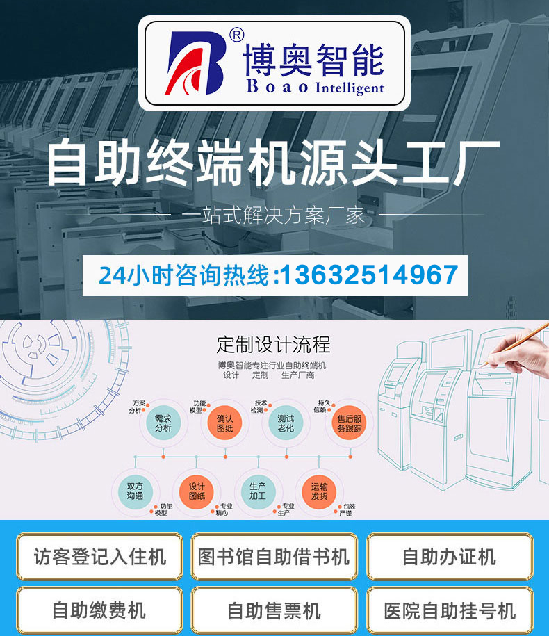 專業(yè)提供電腦觸控產(chǎn)品、自助服務(wù)終端的設(shè)計及生產(chǎn)服務(wù),主要產(chǎn)品自助終端機(jī)、自助打印機(jī)、自助取票機(jī)、自助查詢機(jī)、自助繳費(fèi)機(jī)、自助發(fā)卡機(jī)、自助政務(wù)一體機(jī),產(chǎn)品使用于各個行業(yè);醫(yī)院、學(xué)校、銀行、酒店、景區(qū)等。。。。。公司擁有專業(yè)的生產(chǎn)線,嚴(yán)格的質(zhì)量把控。耐心的咨詢服務(wù)團(tuán)隊及專業(yè)的技術(shù)負(fù)責(zé)團(tuán)體。