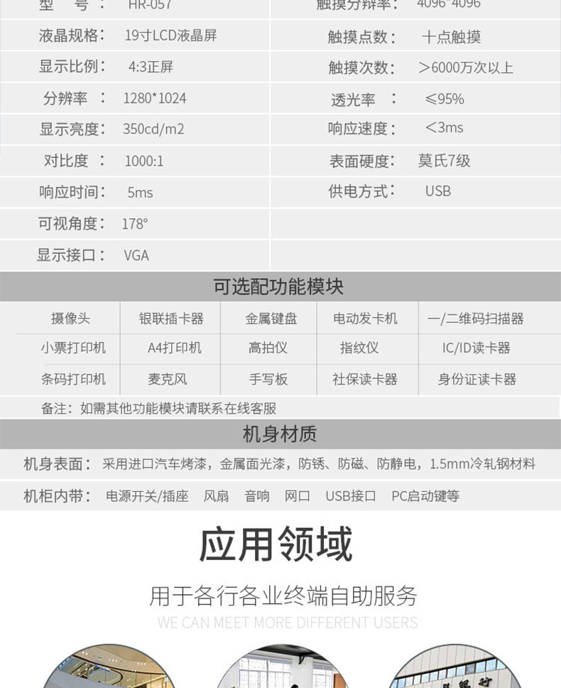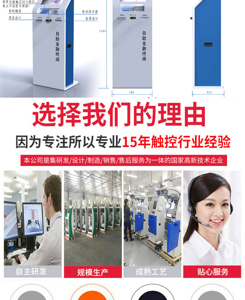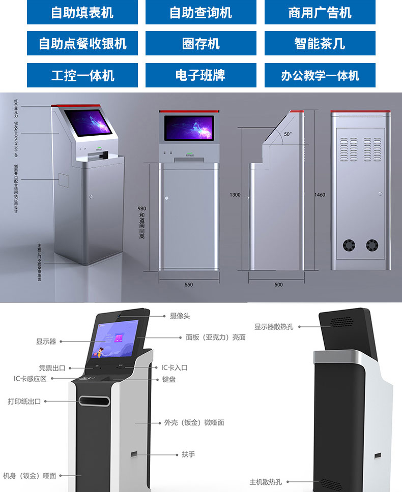 專業提供電腦觸控產品、自助服務終端的設計及生產服務,主要產品自助終端機、自助打印機、自助取票機、自助查詢機、自助繳費機、自助發卡機、自助政務一體機,產品使用于各個行業;醫院、學校、銀行、酒店、景區等。。。。。公司擁有專業的生產線,嚴格的質量把控。耐心的咨詢服務團隊及專業的技術負責團體。