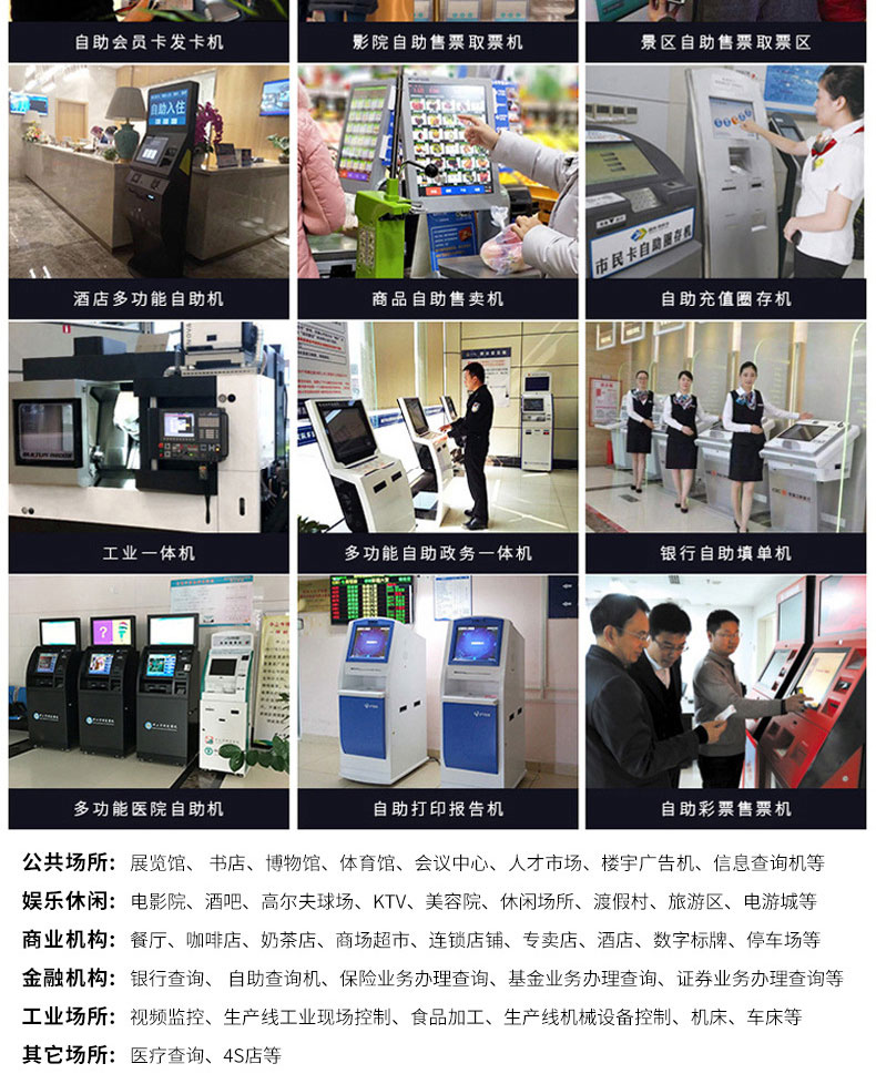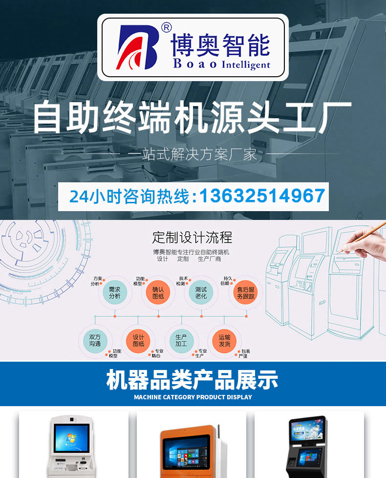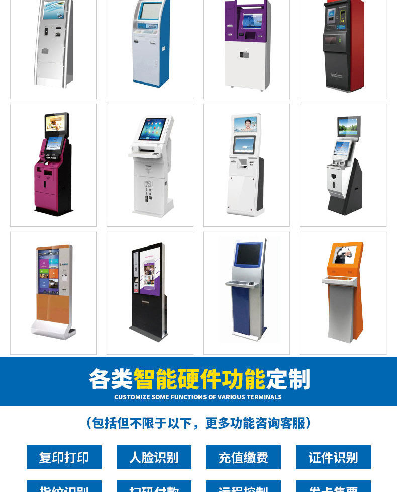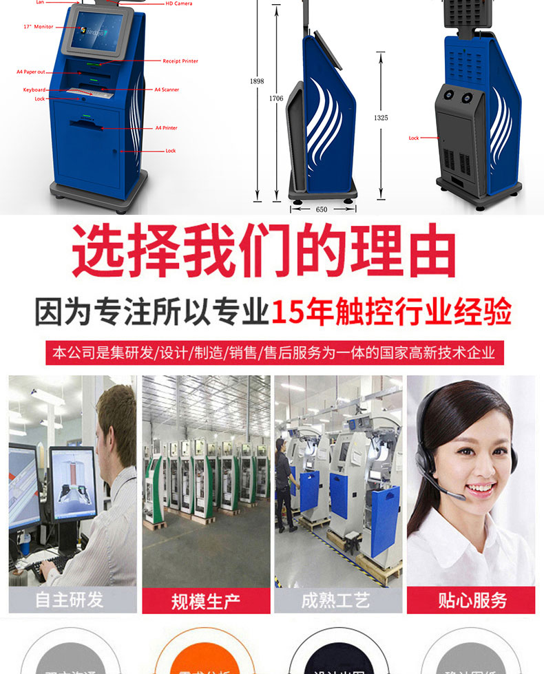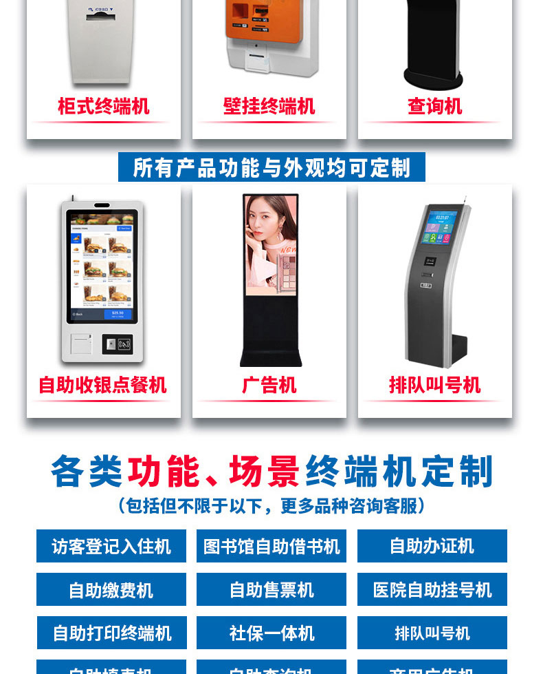 專業提供電腦觸控產品、自助服務終端的設計及生產服務,主要產品自助終端機、自助打印機、自助取票機、自助查詢機、自助繳費機、自助發卡機、自助政務一體機,產品使用于各個行業;醫院、學校、銀行、酒店、景區等。。。。。公司擁有專業的生產線,嚴格的質量把控。耐心的咨詢服務團隊及專業的技術負責團體。