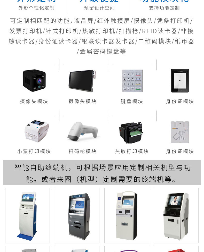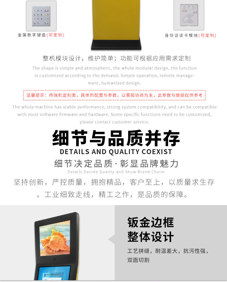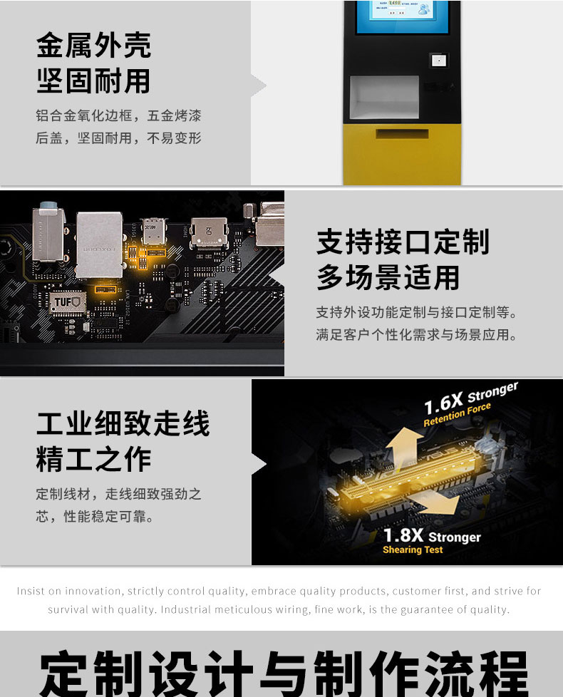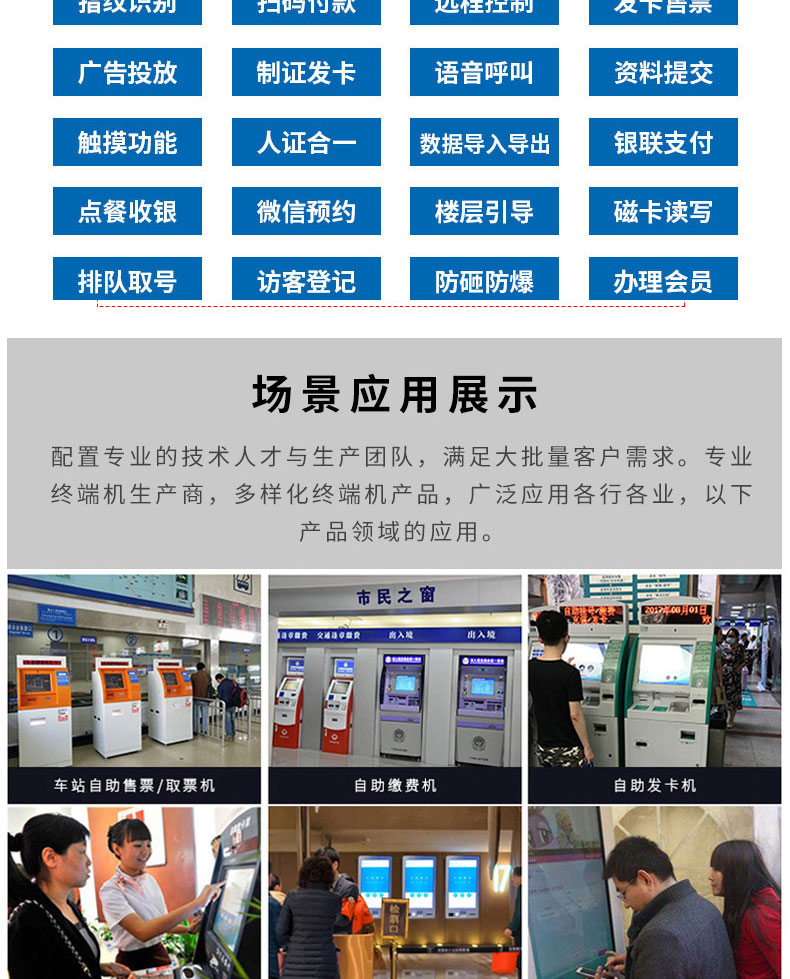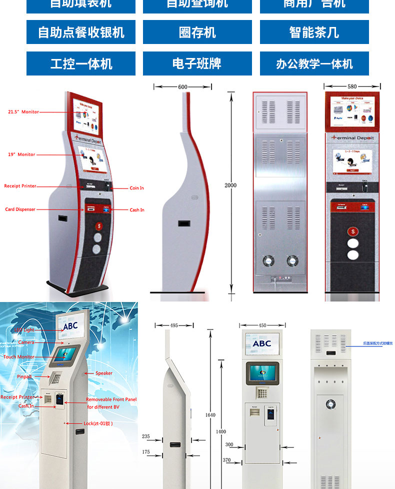 專業提供電腦觸控產品、自助服務終端的設計及生產服務,主要產品自助終端機、自助打印機、自助取票機、自助查詢機、自助繳費機、自助發卡機、自助政務一體機,產品使用于各個行業;醫院、學校、銀行、酒店、景區等。。。。。公司擁有專業的生產線,嚴格的質量把控。耐心的咨詢服務團隊及專業的技術負責團體。