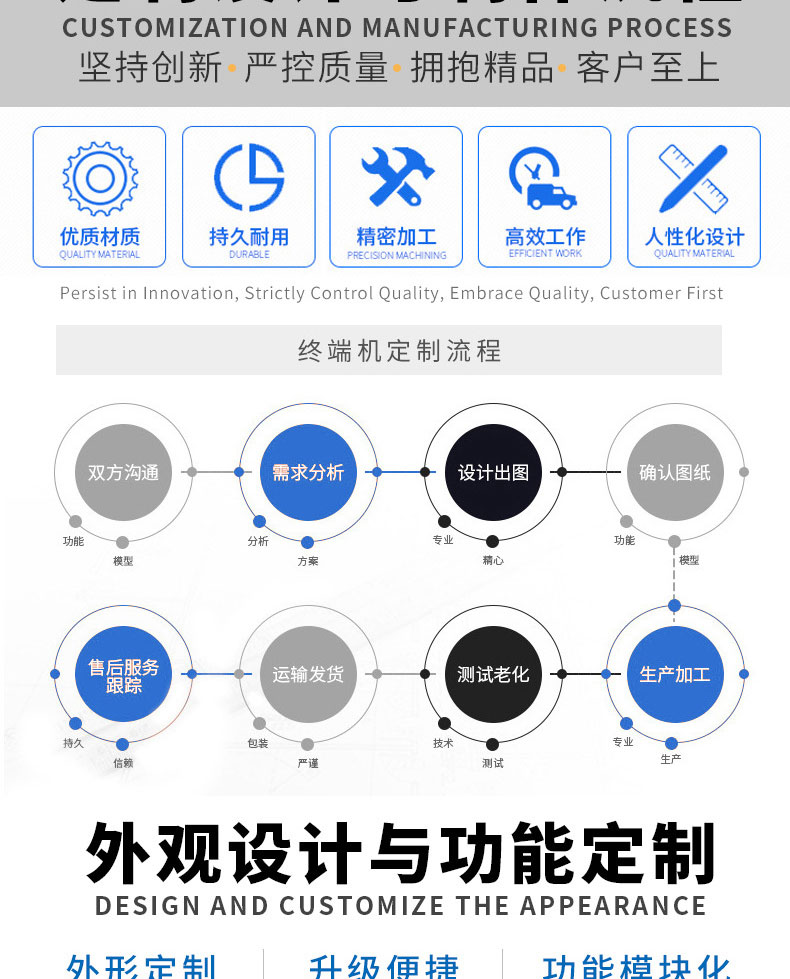 定制設備圖紙設計-數控沖壓-折彎-焊接-刮灰打磨-磨砂清洗-噴底漆-高溫烤漆-機柜部件拼裝-配件安裝-整機調試老華測試-打包發貨。