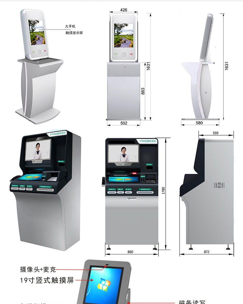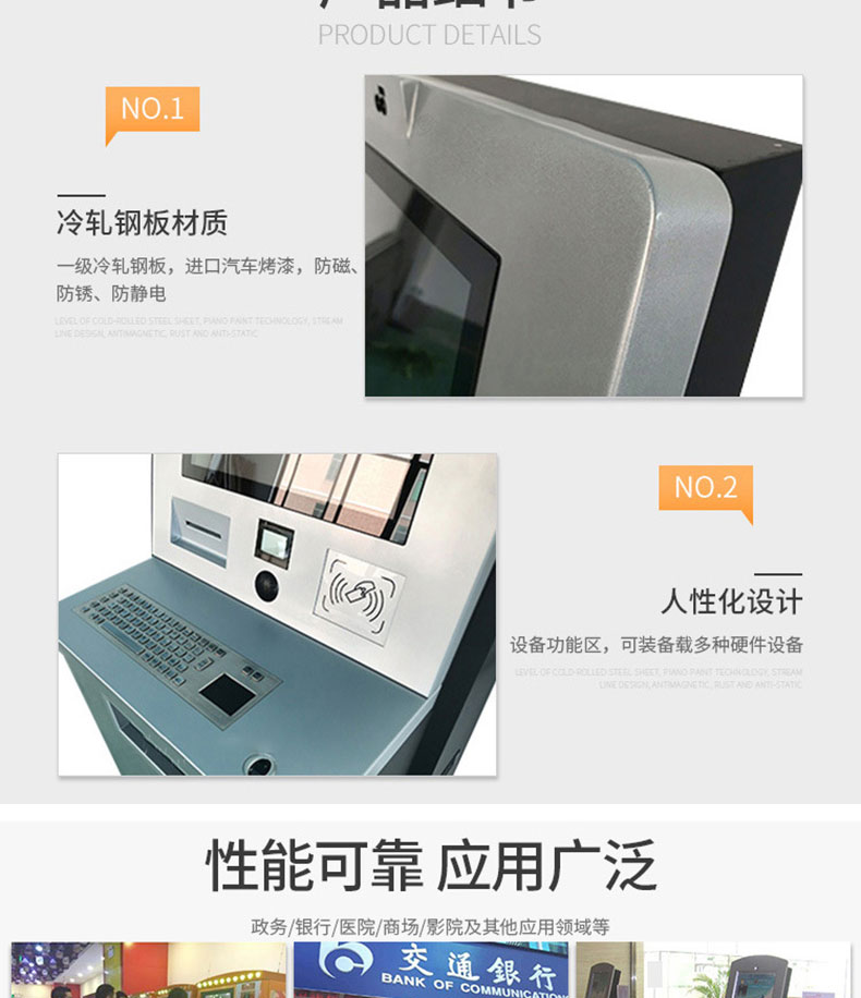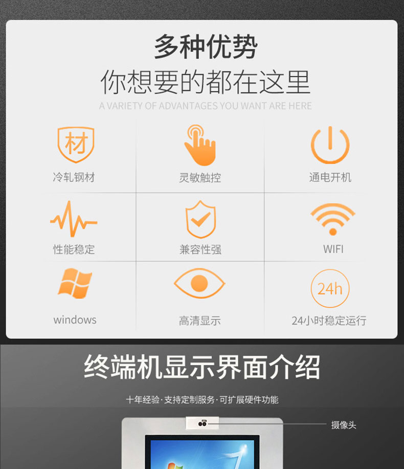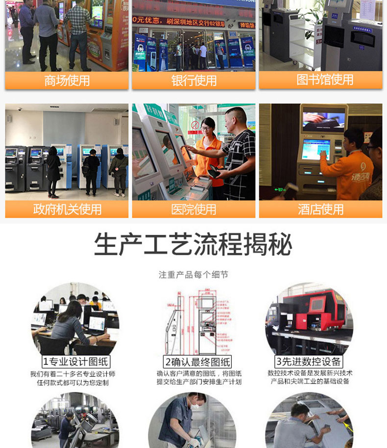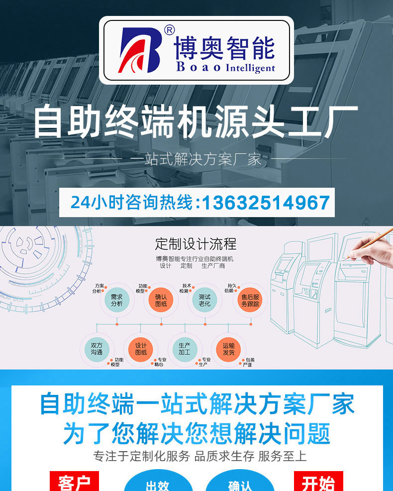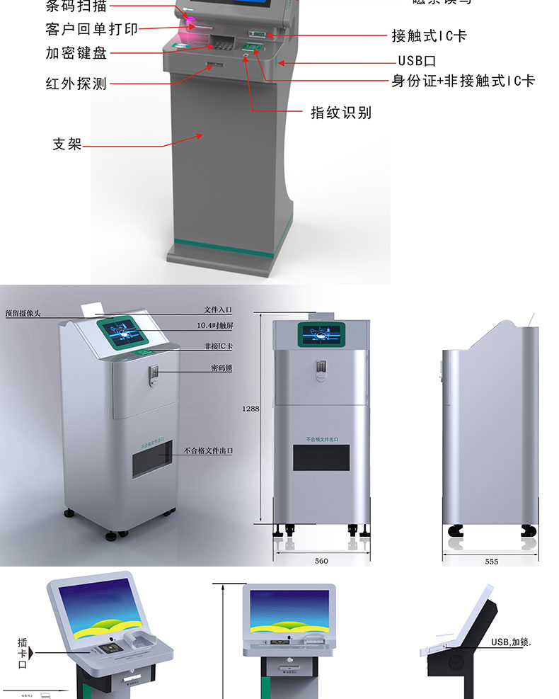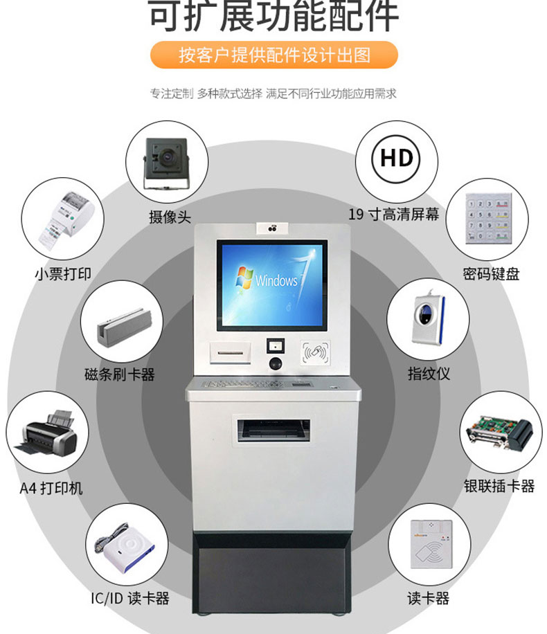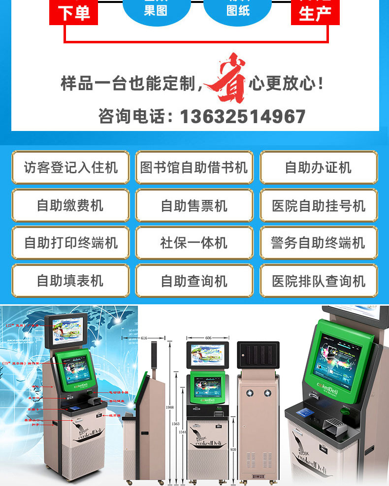 自助終端機定制:定制各種場景各種款式非標終端機;例如訪客機、景區自助取票機、醫院繳費查詢機、醫院自助取單機、社保查詢機、室內外廣告機、排隊叫號機、工控一體機、電力繳費查詢機、圖書自助銷售機、便攜式計算機、酒店自助入住機、自助收銀機等終端。