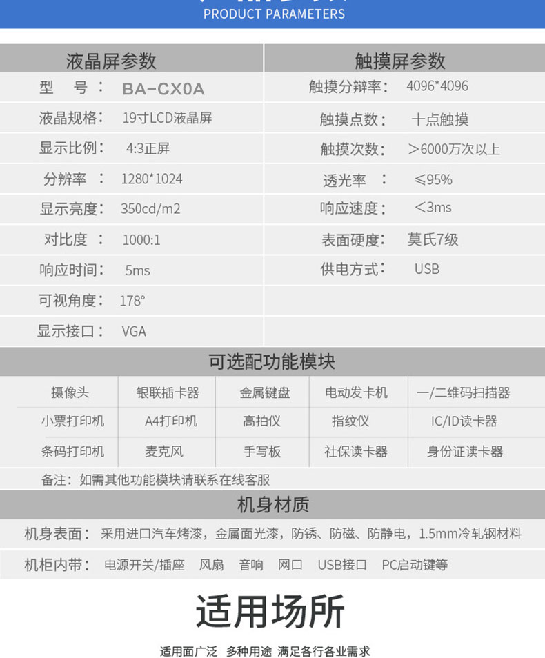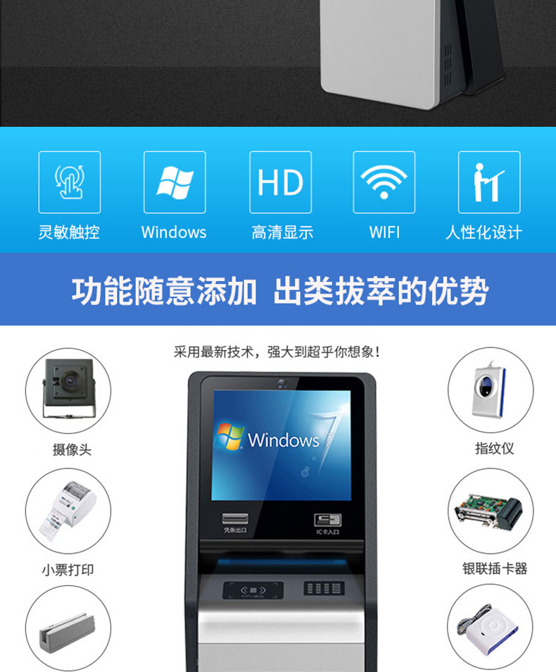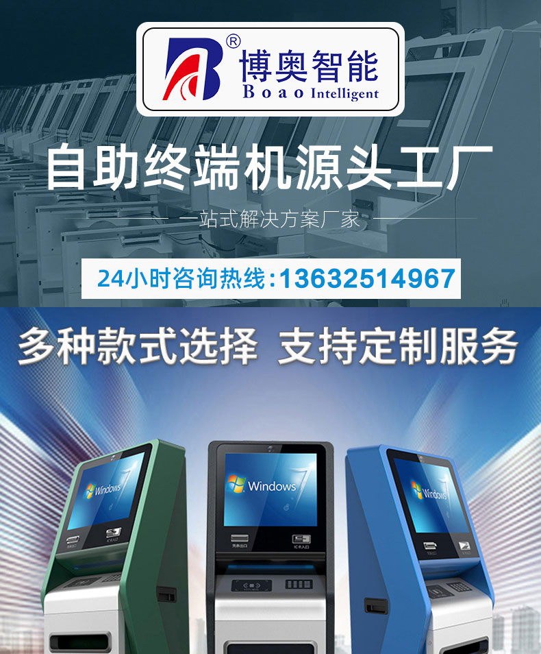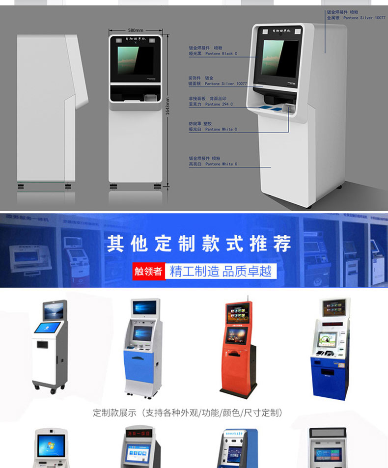 自助終端機定制:定制各種場景各種款式非標終端機;例如訪客機、景區自助取票機、醫院繳費查詢機、醫院自助取單機、社保查詢機、室內外廣告機、排隊叫號機、工控一體機、電力繳費查詢機、圖書自助銷售機、便攜式計算機、酒店自助入住機、自助收銀機等終端。