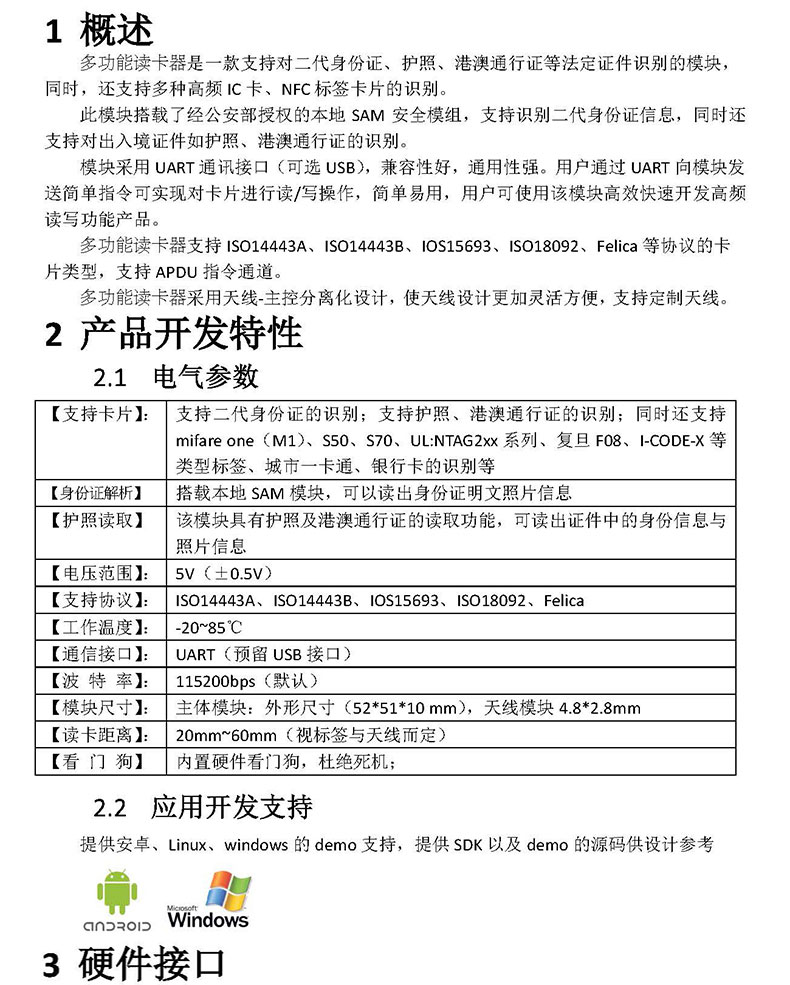 多功能讀卡器是一款支持對二代身份證、護照、港澳通行證等法定證件識別的模塊,同時,還支持多種高頻 IC 卡、NFC 標簽卡片的識別。