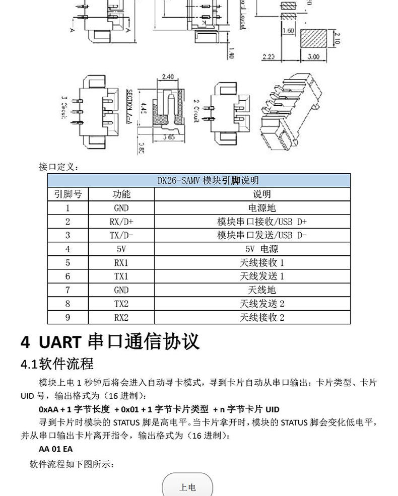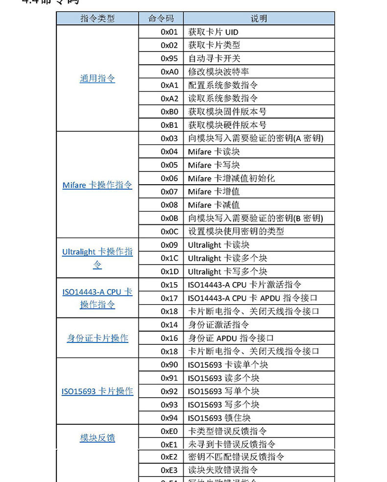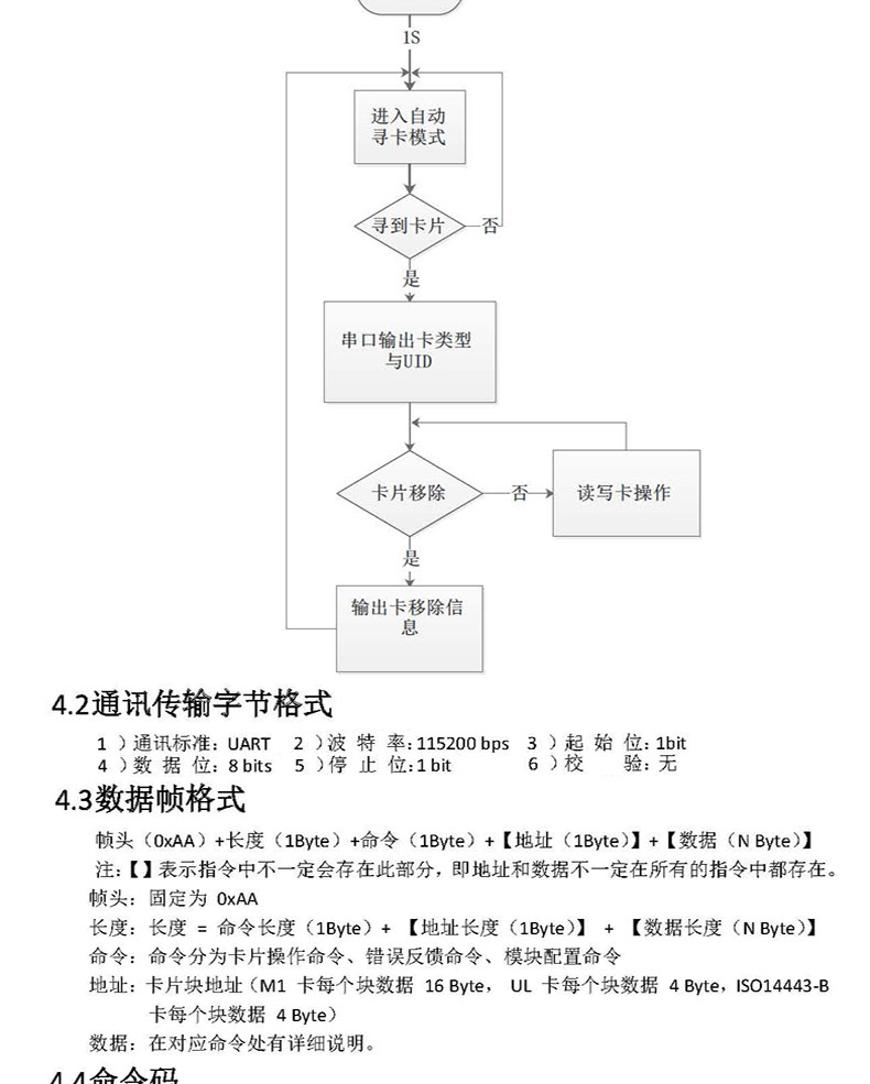 模塊采用 UART 通訊接口(可選 USB),兼容性好,通用性強。用戶通過 UART 向模塊發送簡單指令可實現對卡片進行讀/寫操作,簡單易用,用戶可使用該模塊高效快速開發高頻讀寫功能產品。