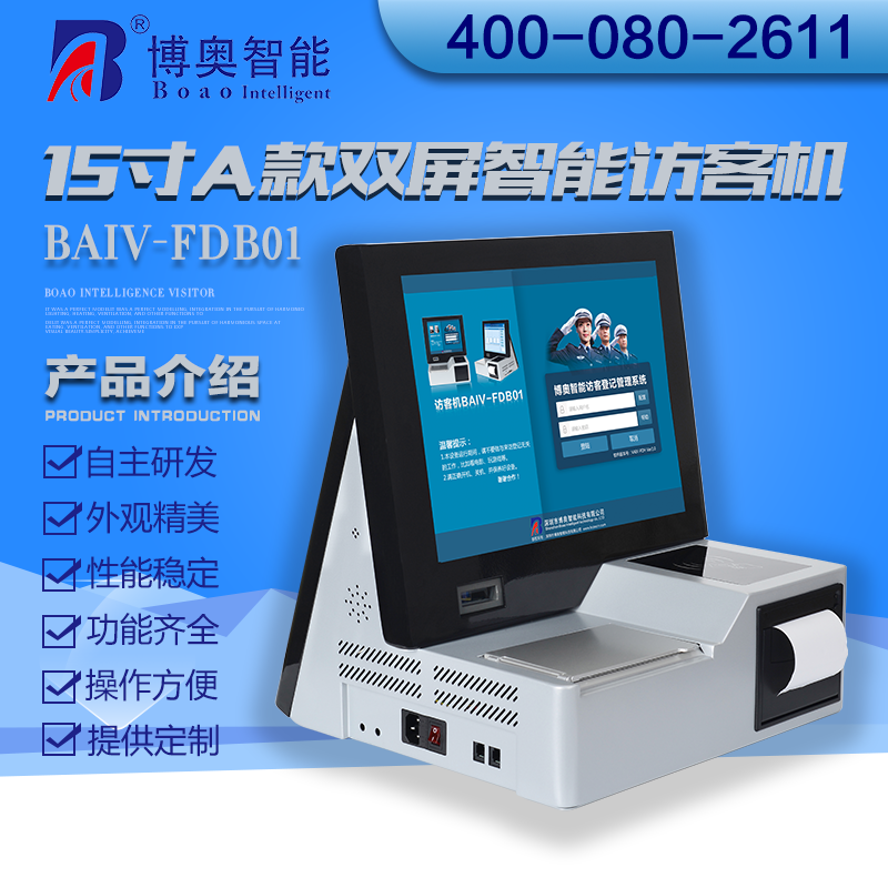 ? ? ? 15寸B款雙屏智能訪客機(jī)是博奧智能自主開發(fā),采用人體工程學(xué)與模塊化設(shè)計(jì)相結(jié)合,融合計(jì)算機(jī)、觸摸屏手寫、證件識(shí)別(OCR),射頻識(shí)別、指紋生物識(shí)別、熱敏打印、條碼、數(shù)碼攝像、自動(dòng)制證、硬件加密、網(wǎng)絡(luò)等技術(shù);選用鈑金材料、表面噴粉工藝加工出來的一款訪客管理終端,訪客管理終端內(nèi)部裝有WIN7操作系統(tǒng)SQL Server數(shù)據(jù)庫及我公司自主開發(fā)的訪客登記管理軟件等主要軟件,從而匯集成了一套完善的智能訪客登記管理系統(tǒng),它具有外觀精美,功能完善,操作方便等特點(diǎn)。