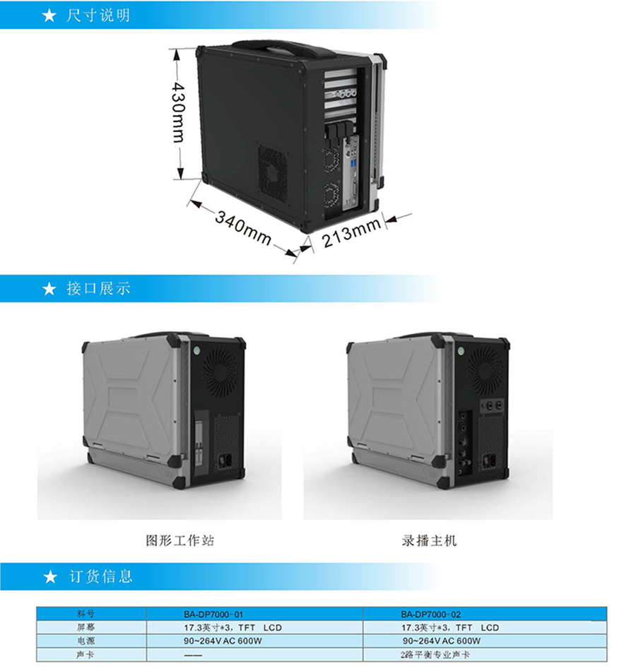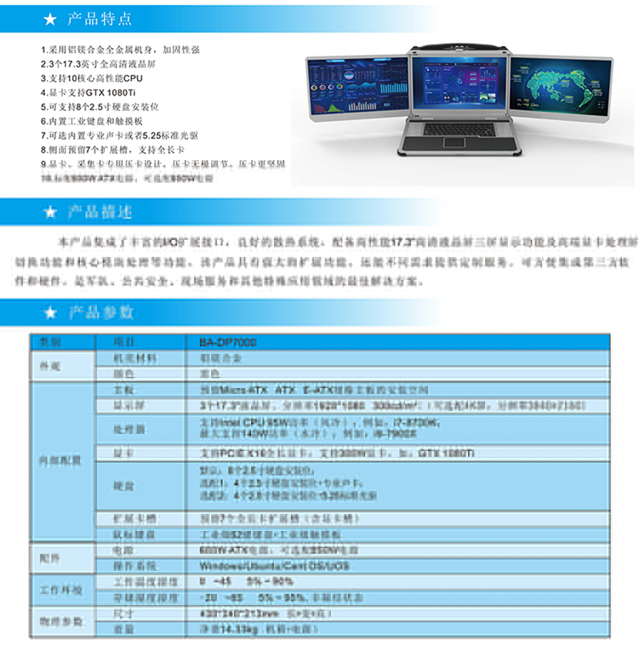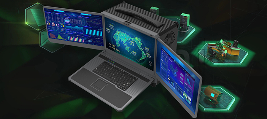 便攜式三屏計算機采用鋁鎂合金全金屬機身,加固性強,外觀精美,體積輕巧,方便攜帶,達(dá)到工業(yè)級性能;本產(chǎn)品集成了豐富的I/O擴展接口, 良好的散熱系統(tǒng), 配備高性能17.3"高清液晶屏,三屏顯示功能及高端顯卡處屏切換功能和核心模塊處理等功能, 該產(chǎn)品具有強大的擴展功能, 還能不同需求提供定制服務(wù)。可方便集成第三軟件和硬件。是軍隊、公共安全、現(xiàn)場服務(wù)和其他特殊應(yīng)用領(lǐng)域的最佳解決方案!