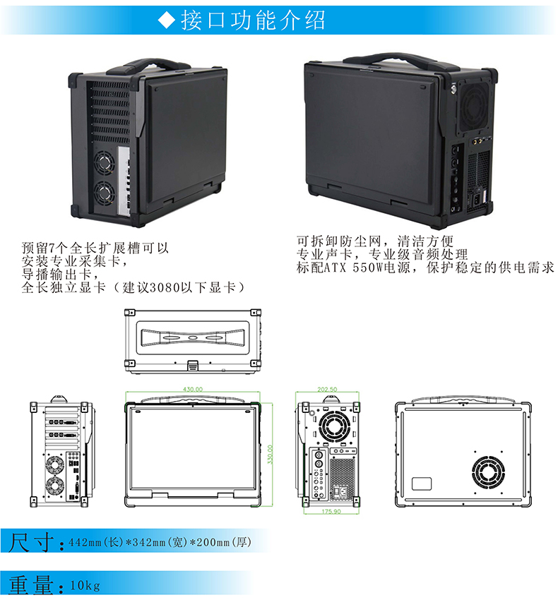 廣電影視導播直播錄播系統(tǒng)一體計算機工業(yè)級加固防振室外高亮便攜式17.3寸工控電腦支持定制加工國產系統(tǒng),采用鋁鎂合外殼,體積輕巧,性能穩(wěn)定,方便攜帶等特點;集成導播鍵盤、音頻模塊、視頻加速卡、導播輸出卡、17.3寸高亮屏,保證戶外使用也清晰可見,用于廣電行業(yè)和教育行業(yè)的專業(yè)級導播/直播便攜設備。