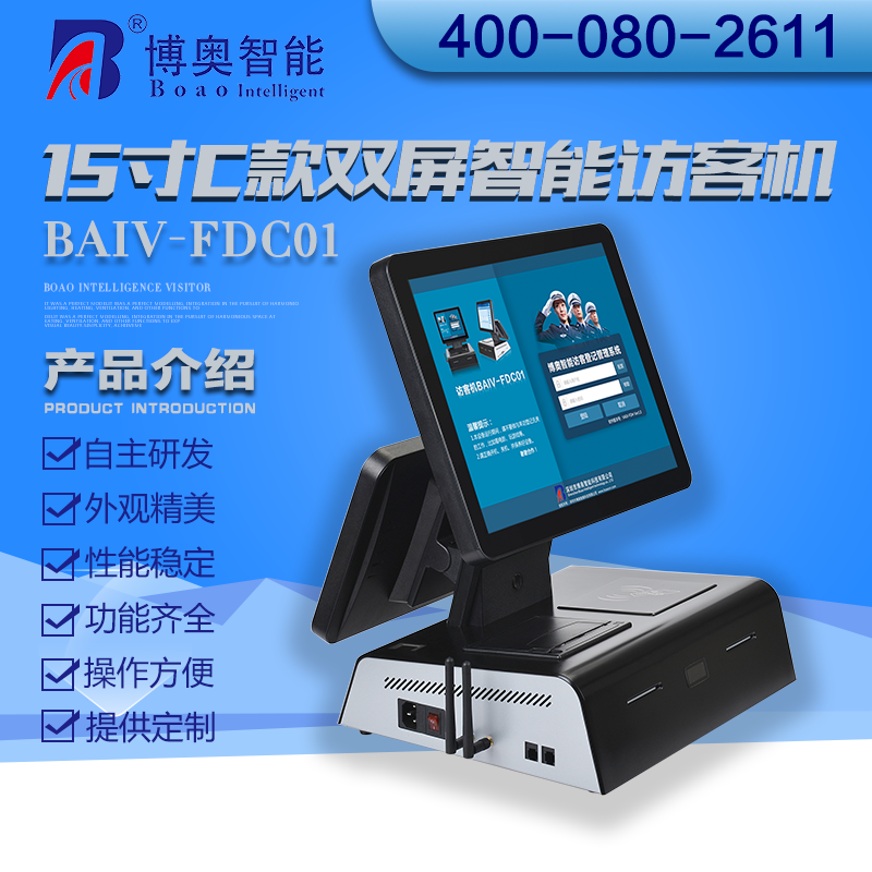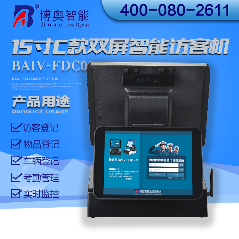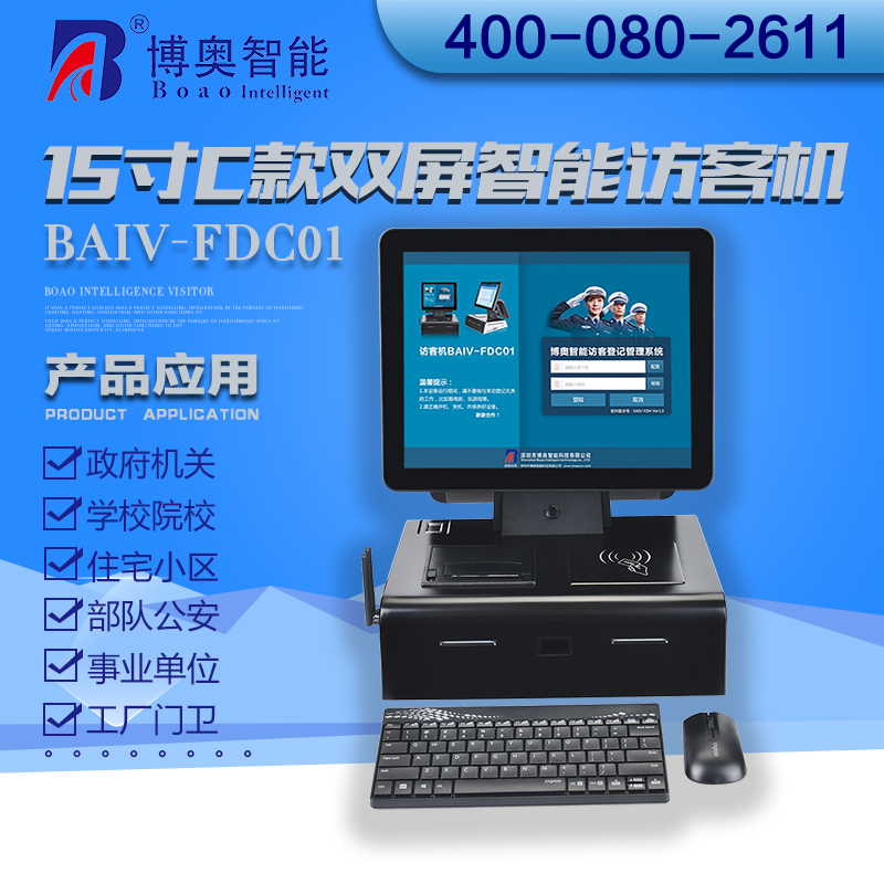 ? ? ? 15寸C款雙屏智能訪客機主要用在政府機關、關口、機場、軍隊、公安、法院、學校、事業單位、花園小區、高檔寫字樓、工廠等門衛傳達室用來訪客登記管理;辦公大廳、營業大廳、醫院等場所做為辦公設備