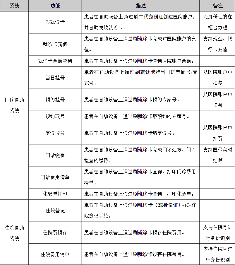 2.?全程自助應用?本方案從發卡到掛號/預約掛號、現金/銀行卡充值、就診繳費、費用清單打印、信息查詢,患者可全程自助操作,可實現一個全功能的人工窗口功能。