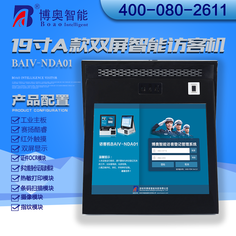 ? ? ? 19寸A款雙屏智能訪客機是博奧智能自主開發,采用人體工程學與模塊化設計相結合,融合計算機、觸摸屏手寫、證件識別(OCR),射頻識別、指紋生物識別、熱敏打印、條碼、數碼攝像、自動制證、硬件加密、網絡等技術;選用鈑金材料、表面噴粉工藝加工出來的一款訪客管理終端,訪客管理終端內部裝有WIN7操作系統 SQL Server數據庫及我公司自主開發的訪客登記管理軟件等主要軟件,從而匯集成了一套完善的智能訪客登記管理系統,它具有外觀精美,功能完善,操作方便等特點。