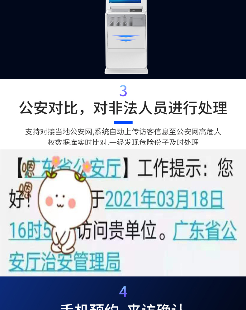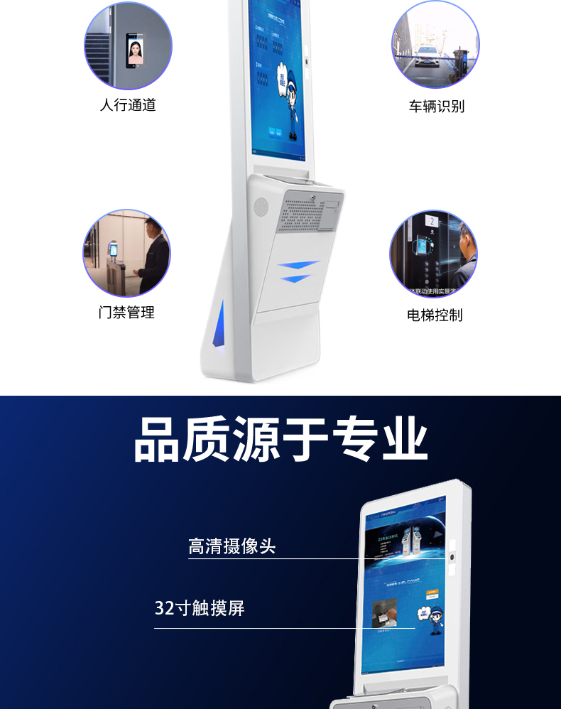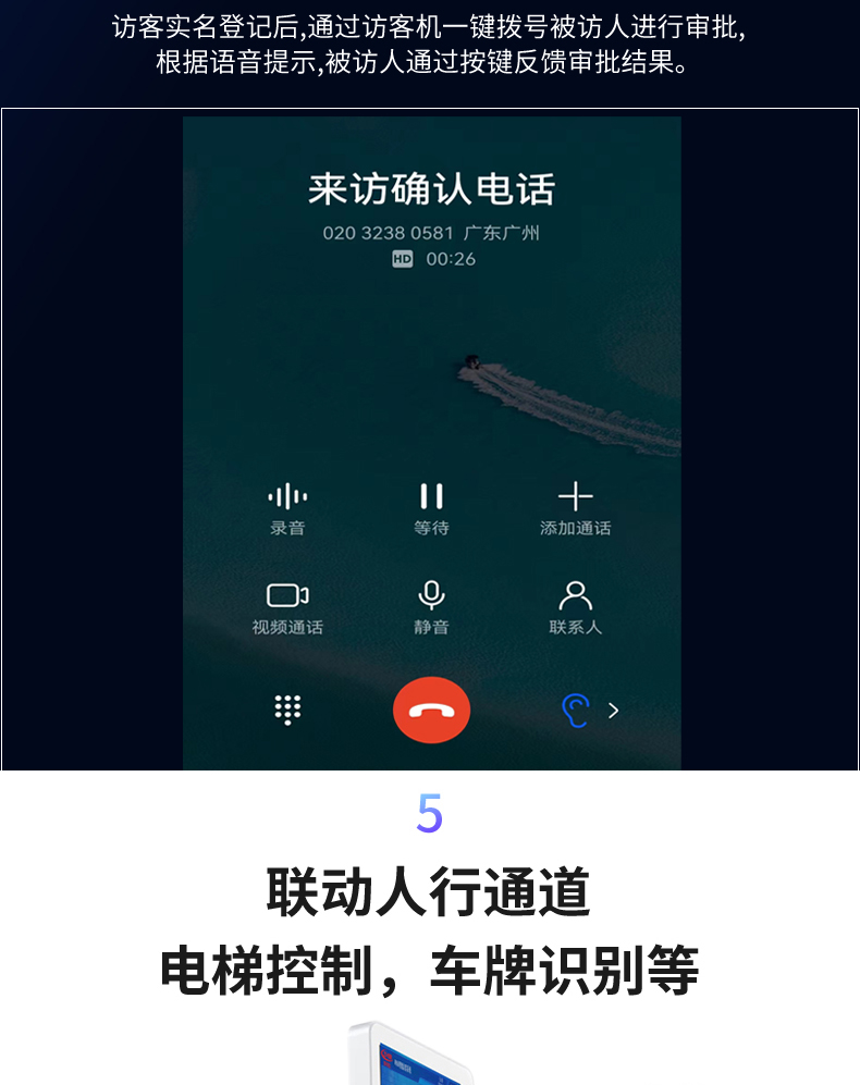 1.人證核驗(人證合一)? 2.電話撥號? 3.門禁聯動? 4.人行通道閘機? 5.電梯聯動??? 6.網絡攝像頭全景拍照? 7.車輛車牌識別控制系統? 8.訪客人車微信預約? 9.體溫檢測? 10.短信發送、確認