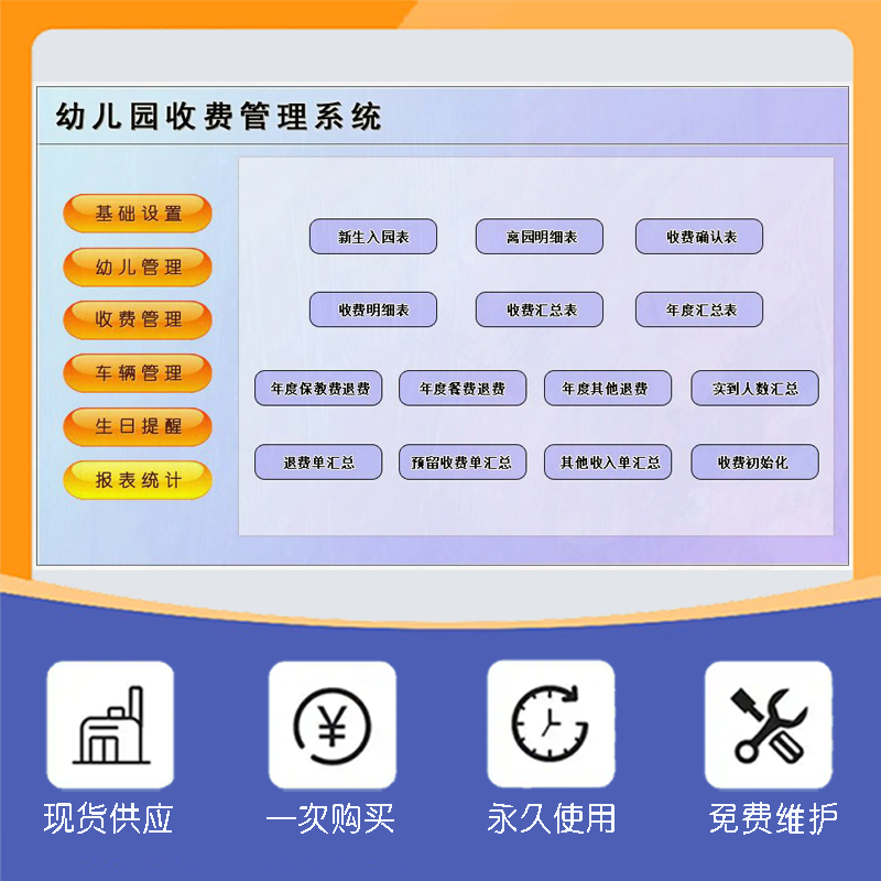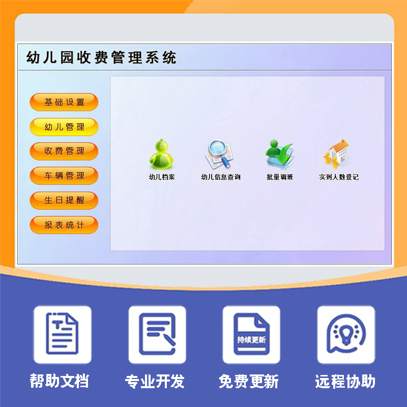《幼兒園收費管理系統》是一款專為中小型幼兒園設計的收費管理軟件。該軟件全面覆蓋了幼兒園收費管理的各個方面,包括基礎信息管理、幼兒信息管理、收費與財務處理、車輛使用管理、生日提醒以及數據報表統計分析。本系統以其快速的數據錄入輔助功能、簡潔明了的用戶界面和強大的數據處理能力,成為幼兒園管理工作的得力助手。