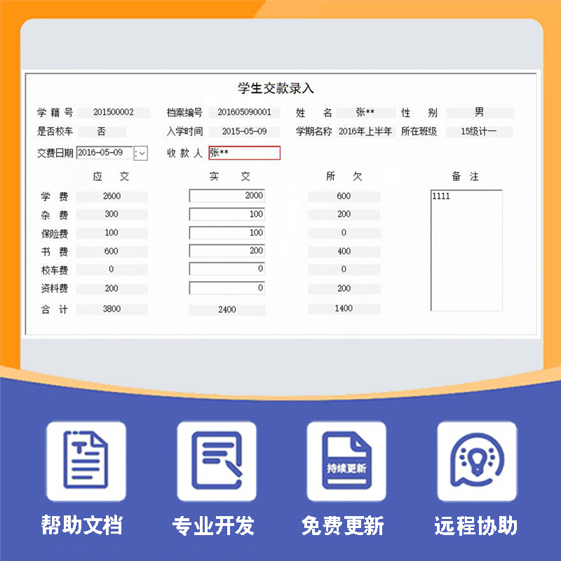 本文介紹了一款針對(duì)學(xué)校收費(fèi)管理的系統(tǒng)。該系統(tǒng)能全面協(xié)助學(xué)校管理學(xué)生各項(xiàng)費(fèi)用,包括學(xué)費(fèi)、書費(fèi)、資料費(fèi)、保險(xiǎn)費(fèi)、雜費(fèi)和校車費(fèi)。通過(guò)簡(jiǎn)單錄入學(xué)生基本信息,系統(tǒng)可自動(dòng)復(fù)制到交費(fèi)信息中,實(shí)現(xiàn)高效的數(shù)據(jù)匯總和統(tǒng)計(jì)。此系統(tǒng)上手快,靈活易用,適合各種學(xué)校財(cái)務(wù)人員使用。