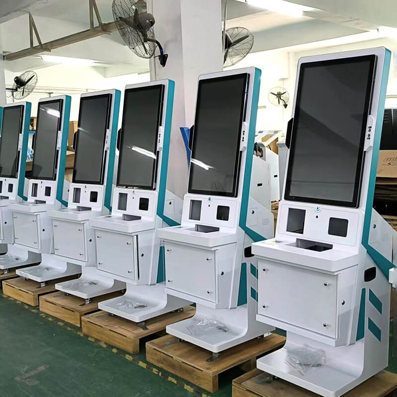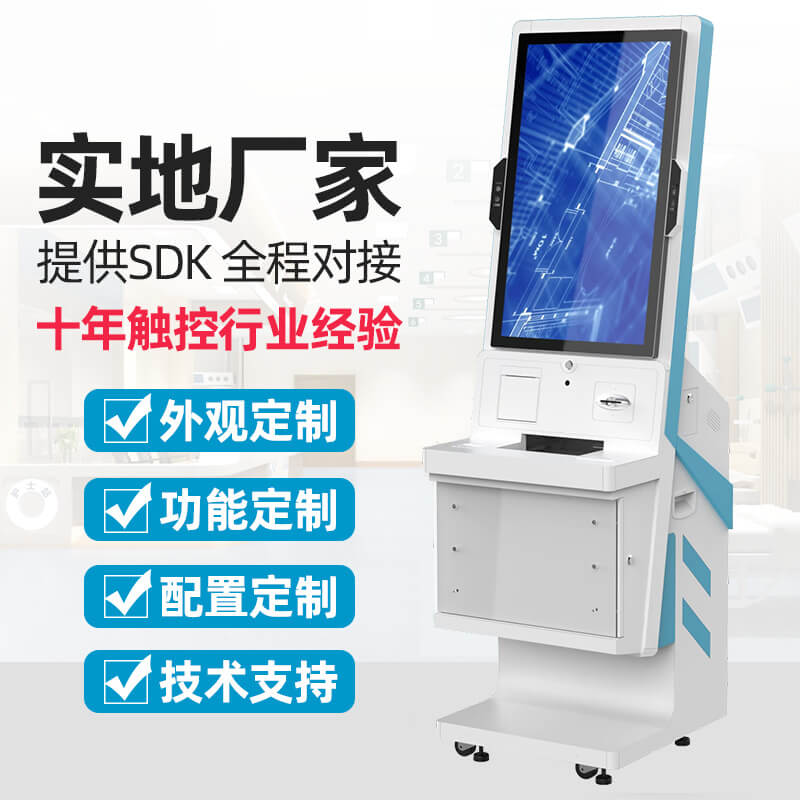 該終端機采用 32 英寸 IPS 高清觸控屏,分辨率 1920×1080,亮度 300cd/m2,響應時間 5ms,支持 10 點觸控;配備雙 200 萬像素支付寶 / 微信專用攝像頭,支持二維碼高速識別與光線自適應;集成符合 ISO 14443 標準的二代身份證讀卡器及全國統一社保接口的社保讀卡器;打印系統含熱敏式小票打印機(150mm/s 打印速度)與可選激光 / 噴墨 A4 打印機;處理器為四核 ARM Cortex-A55(2.0GHz 主頻,可選 Intel 賽揚),存儲 4GB RAM+64GB ROM(可擴展至 128GB);接口包括 4×USB 3.0、RJ45 網口、HDMI、DC 電源接口及 WIFI / 藍牙模塊;電源 AC 220V±10%/50Hz,功耗≤150W(待機≤10W),工作環境溫度 0℃~40℃、濕度 10%~90%(無冷凝)。